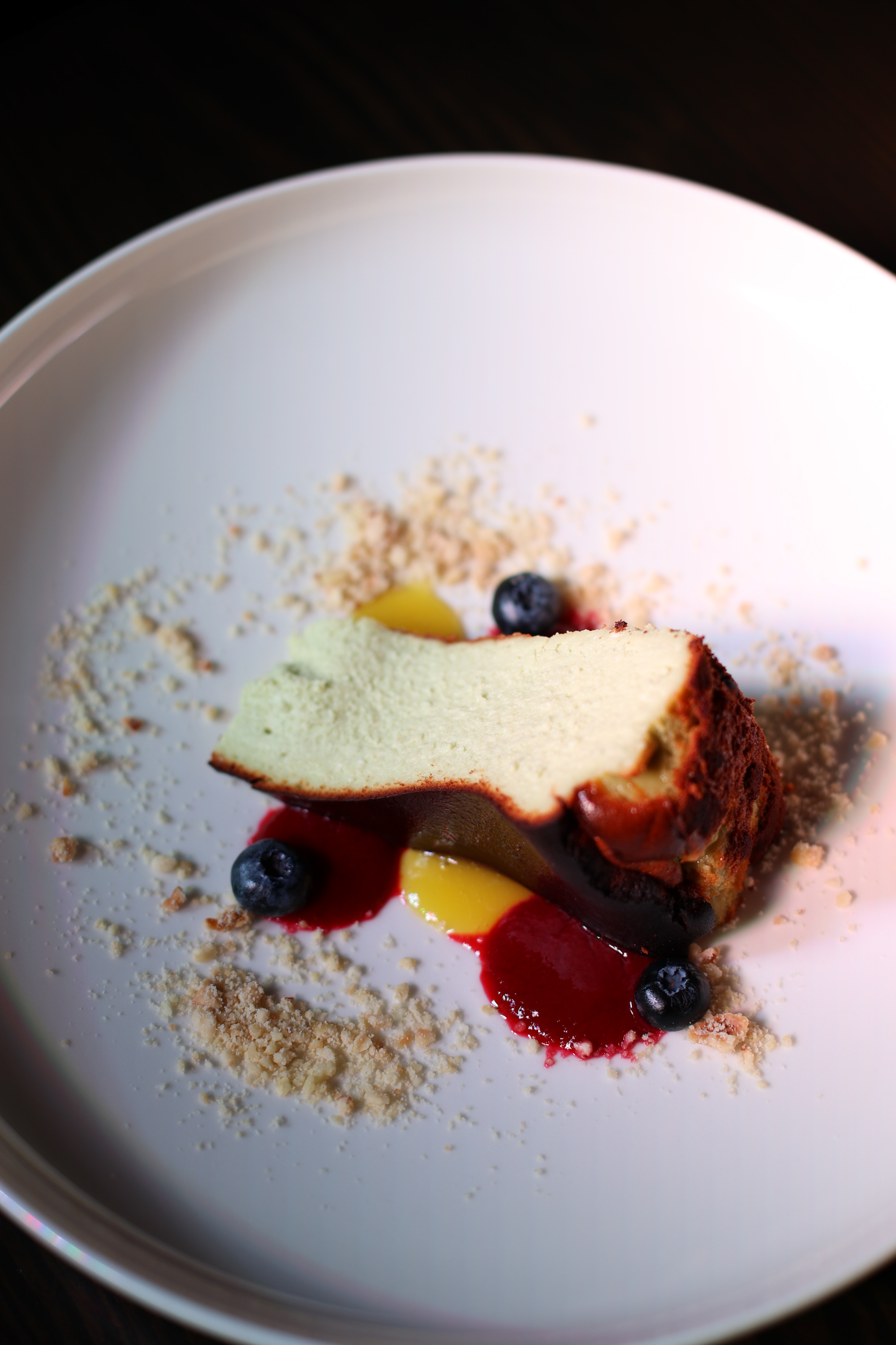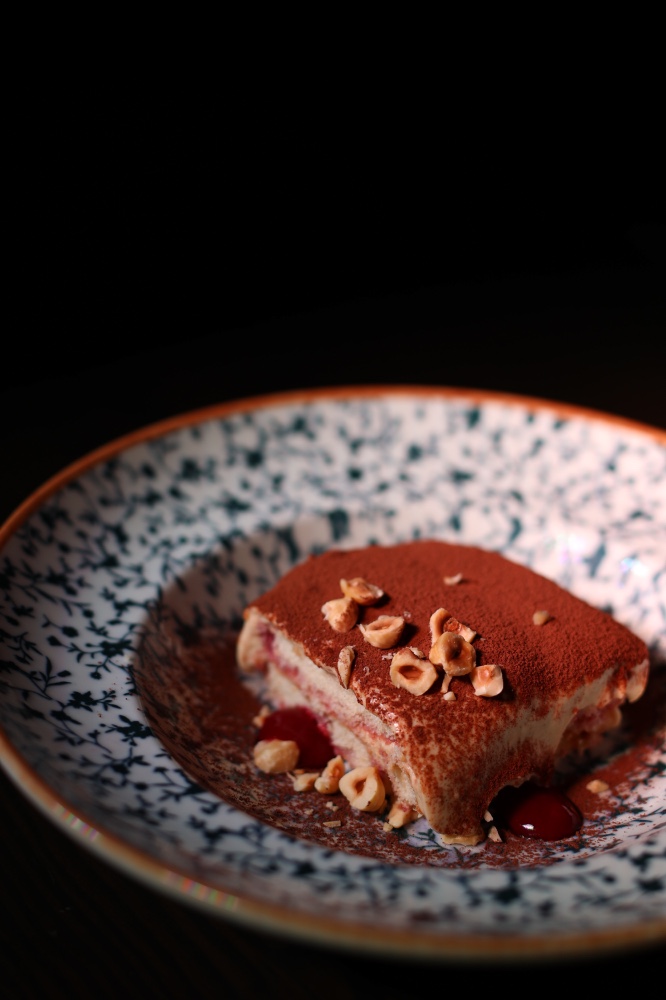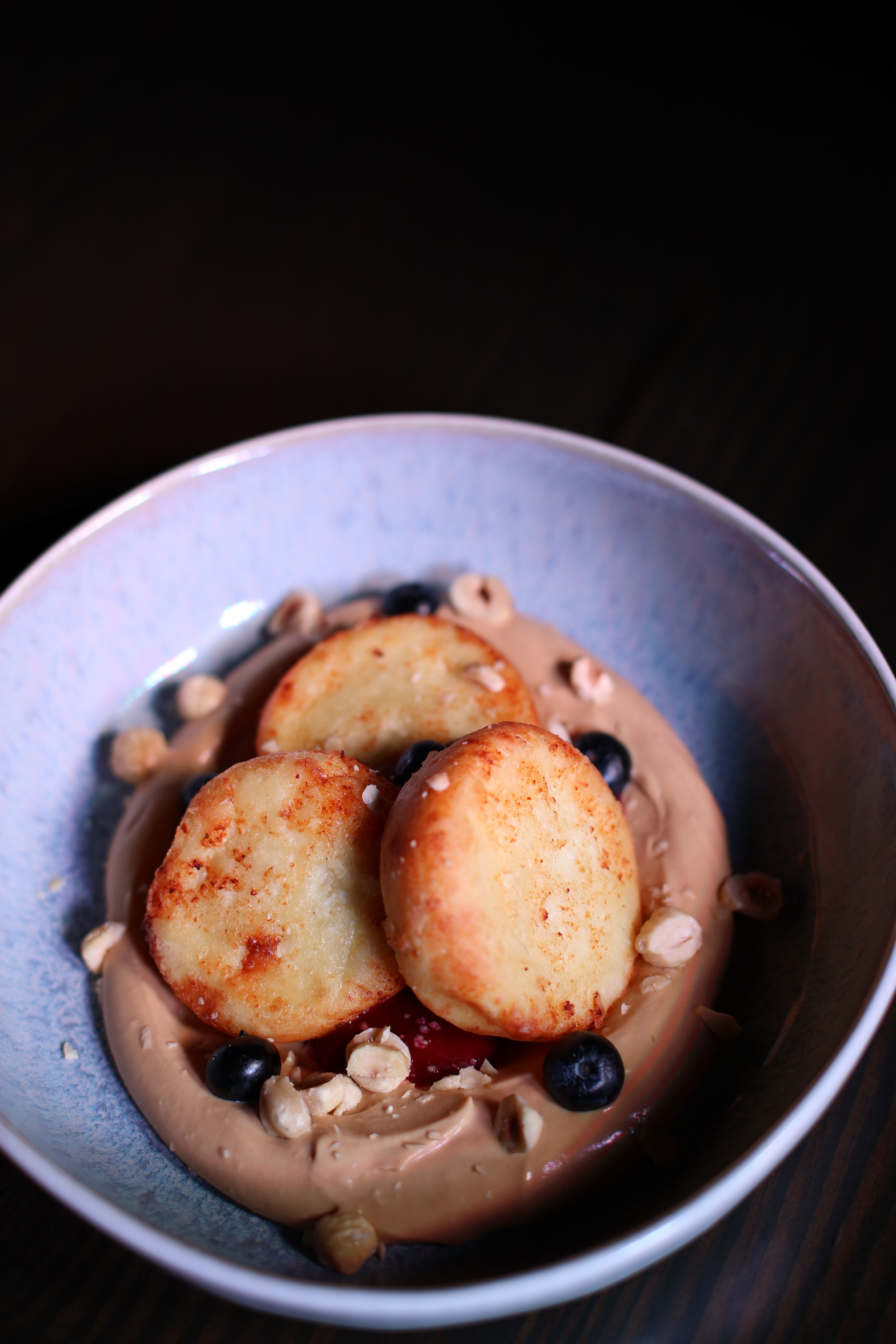 Сирники з кремом з заварним згущеним молоком та фундуком з ягодами