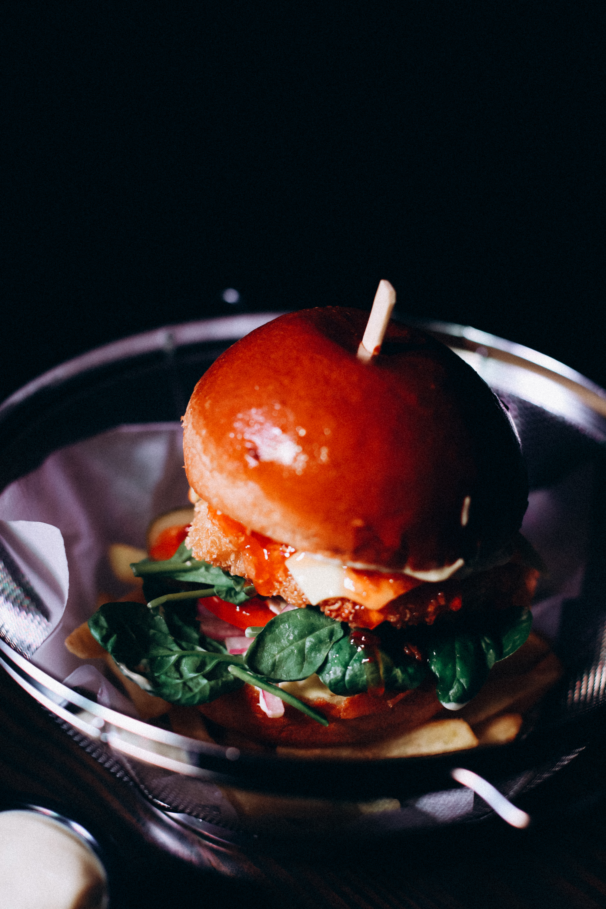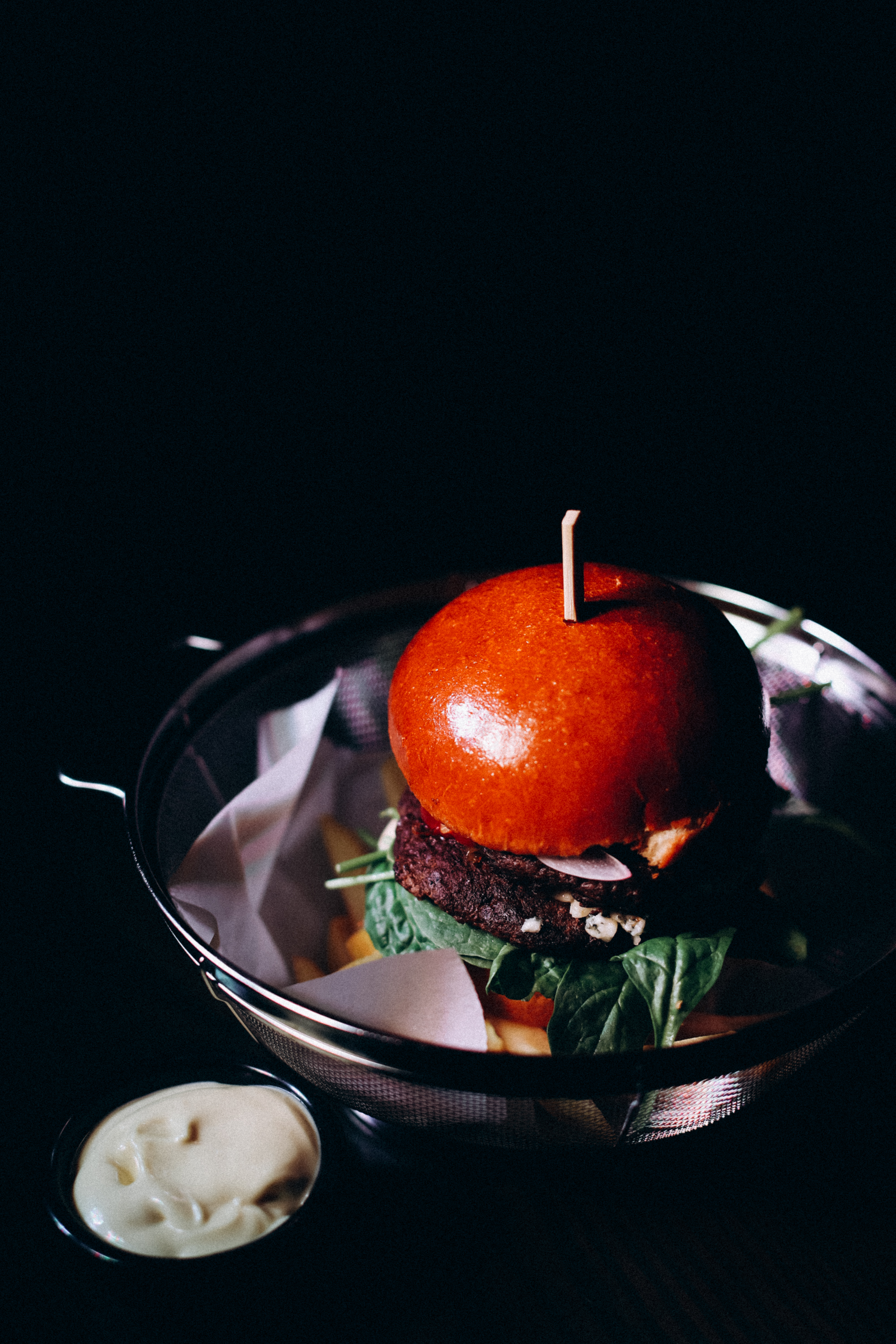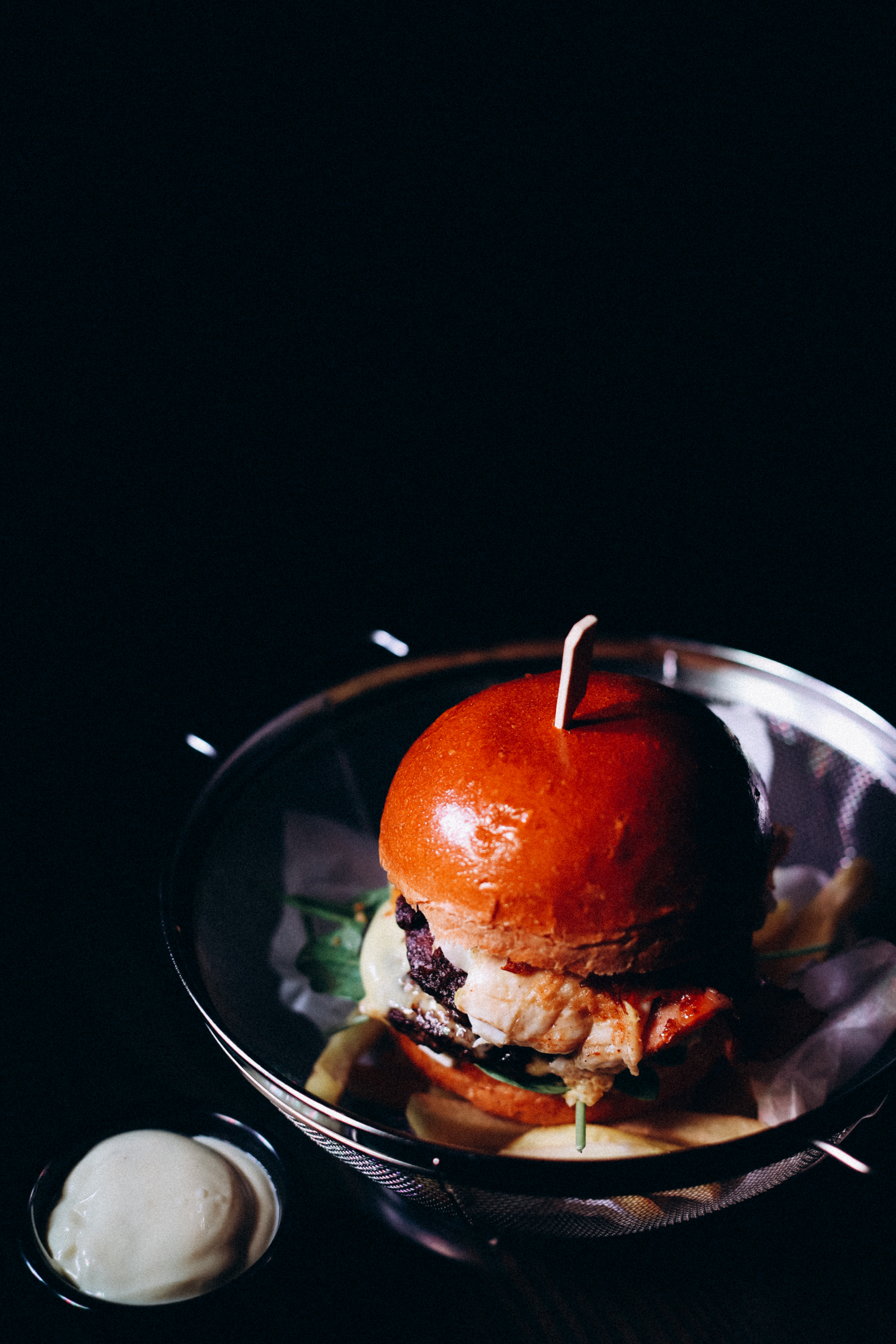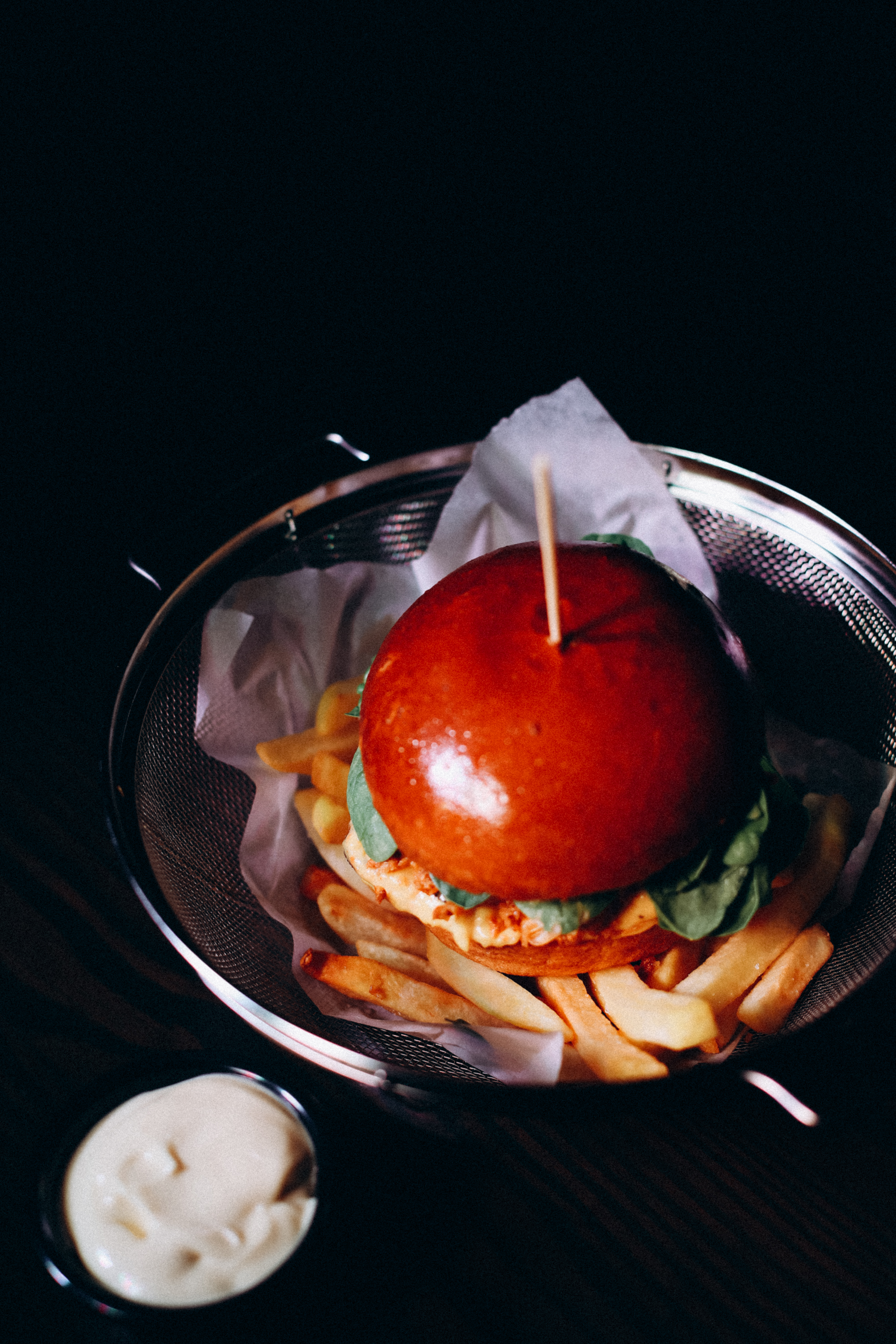 Бургер з мідіями, руколою у сирному соусі та кранч цибулею