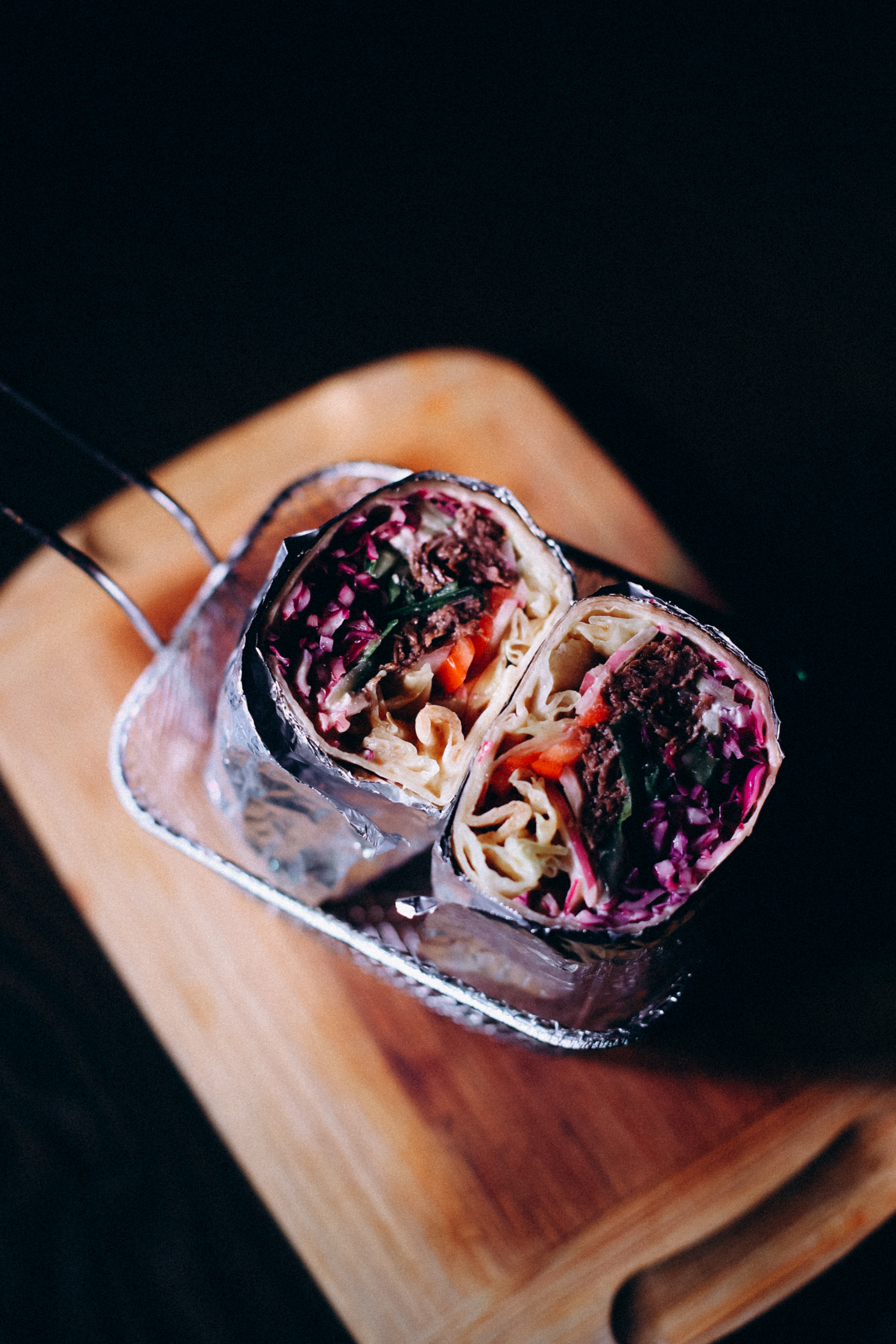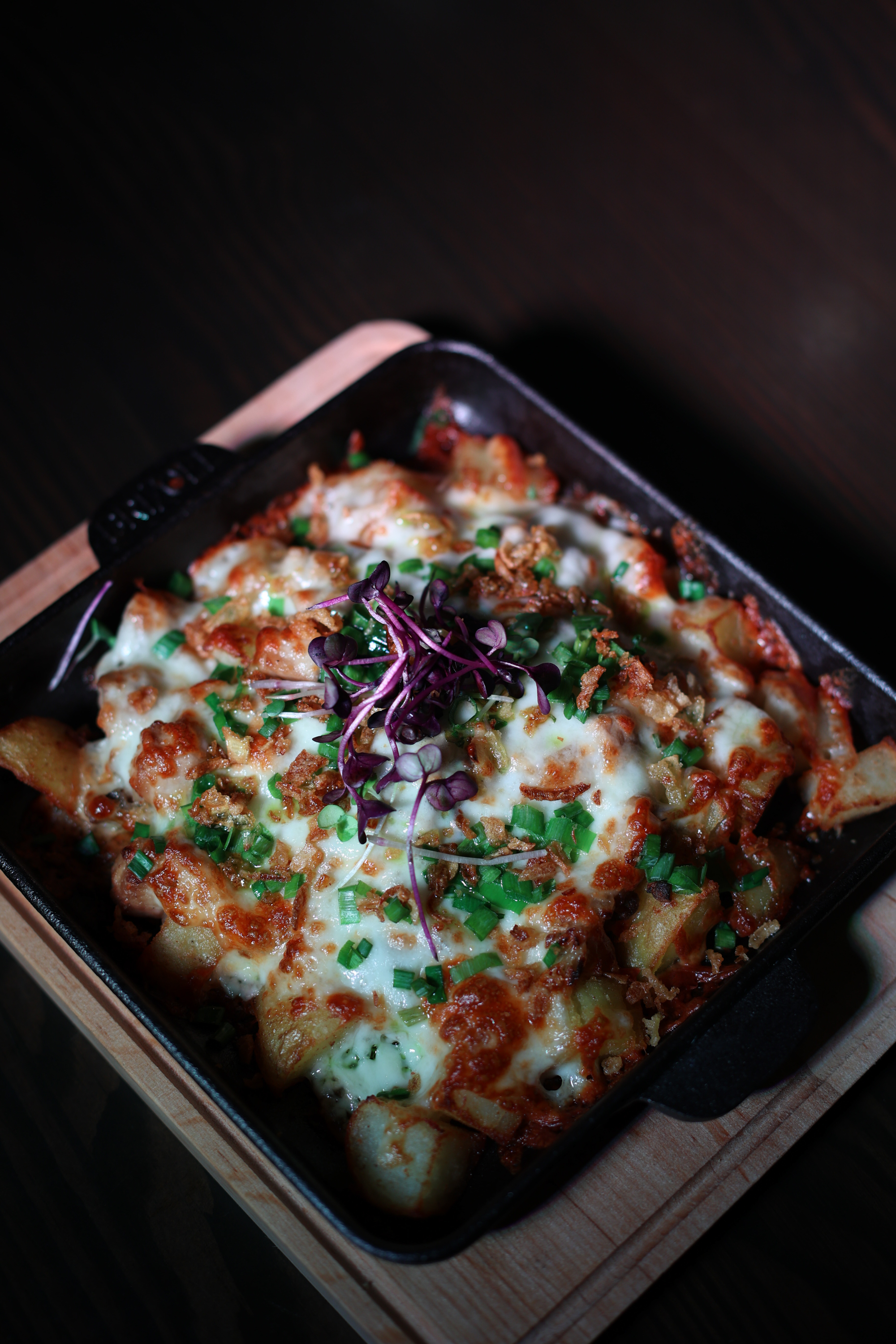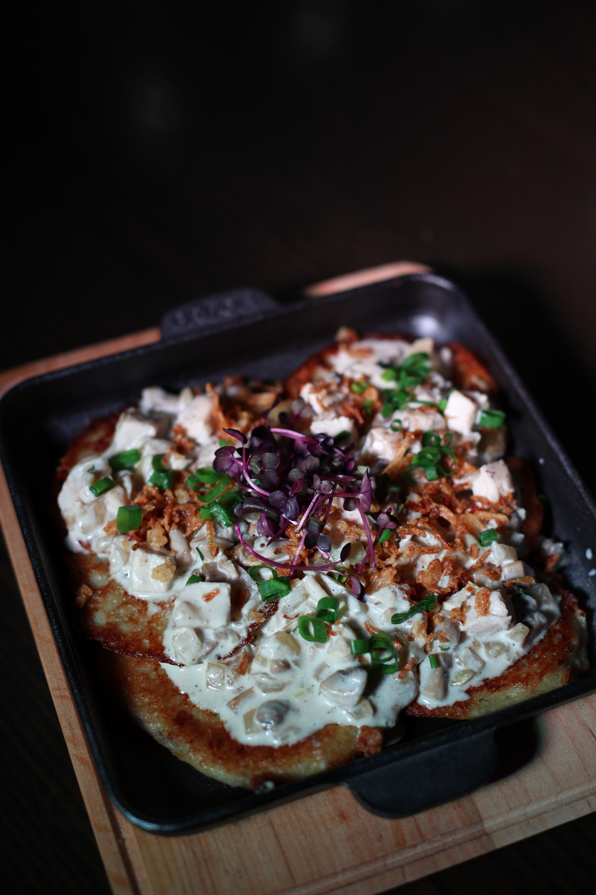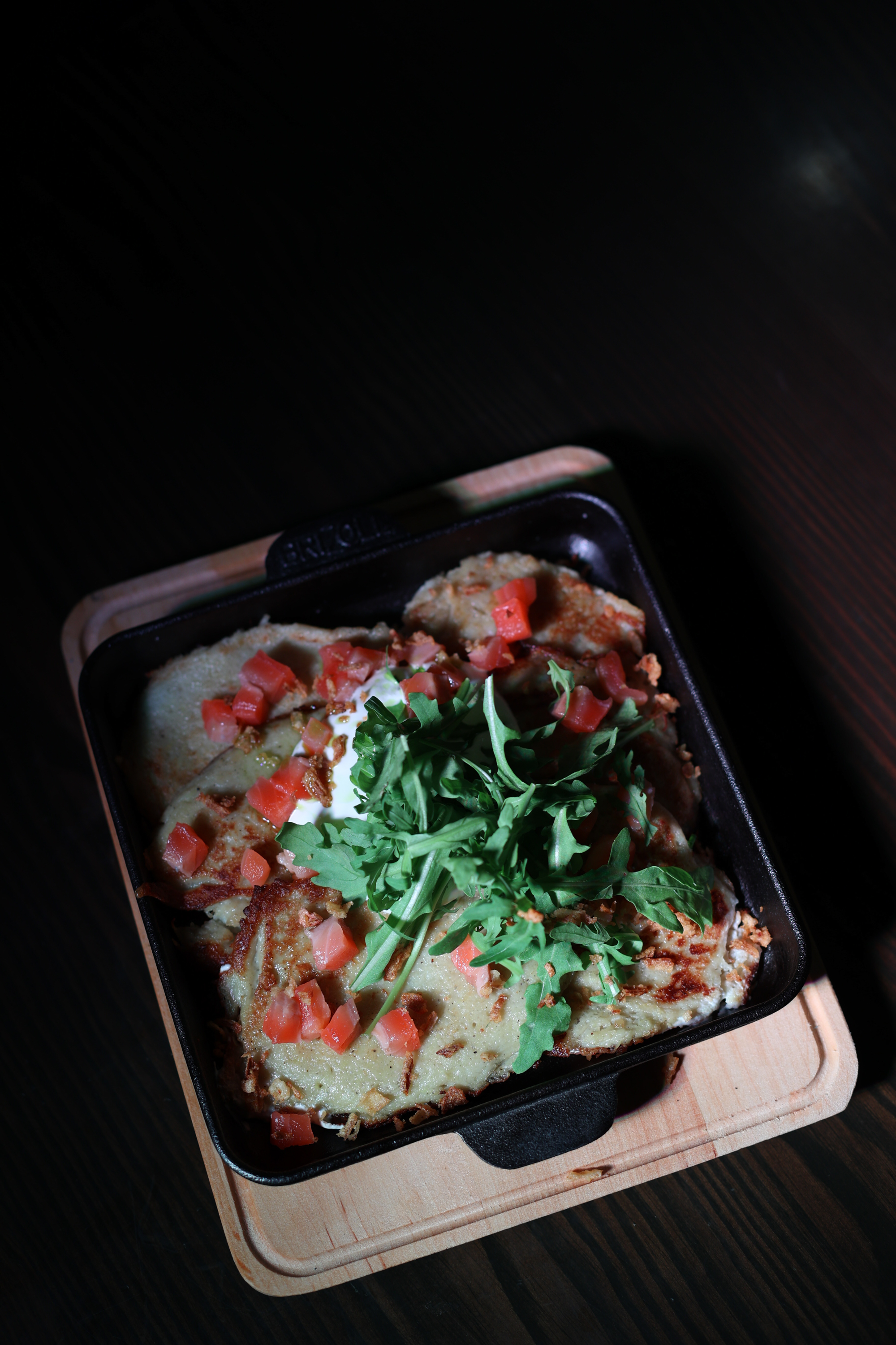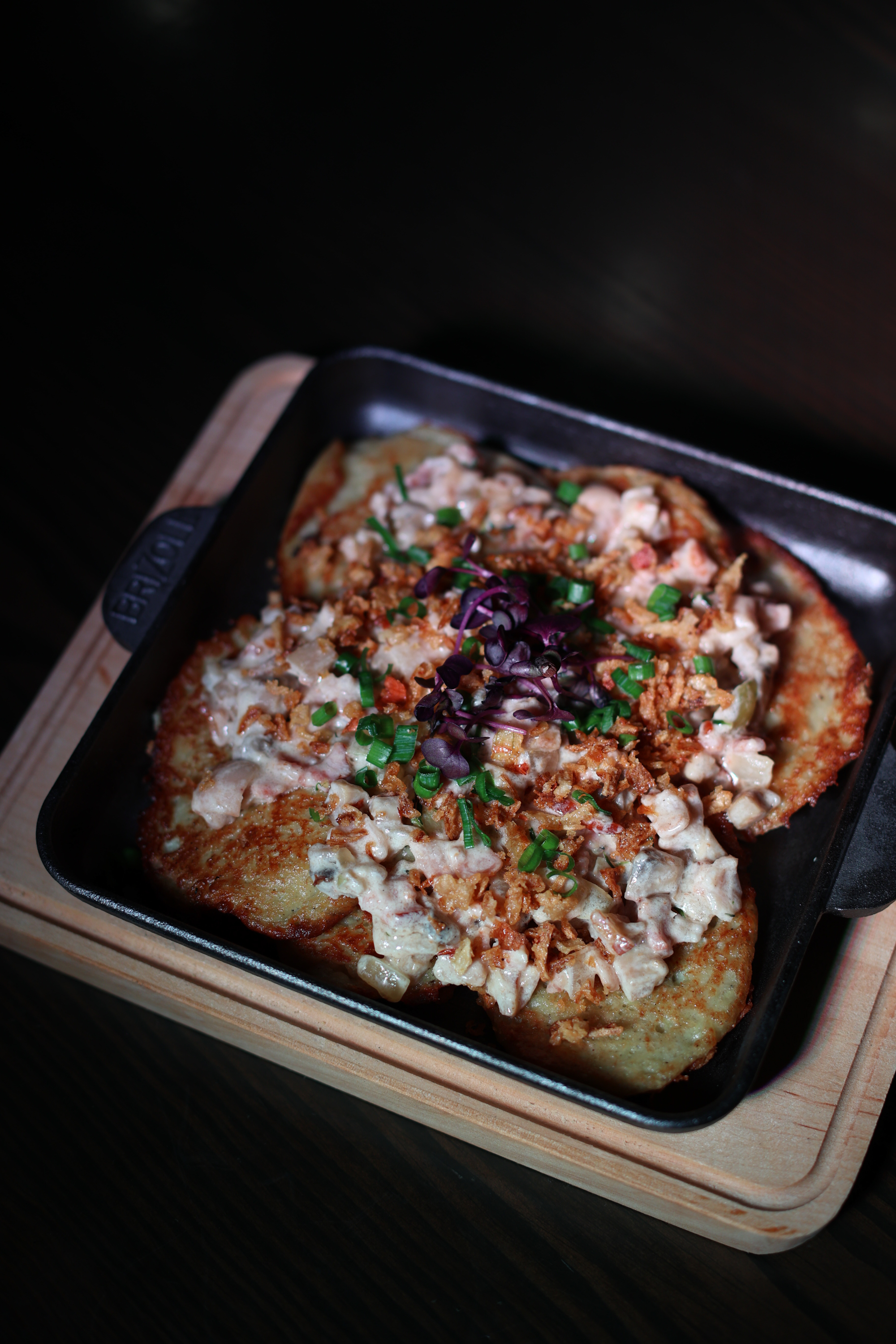 Бургер з мідіями, руколою у сирному соусі та кранч цибулею