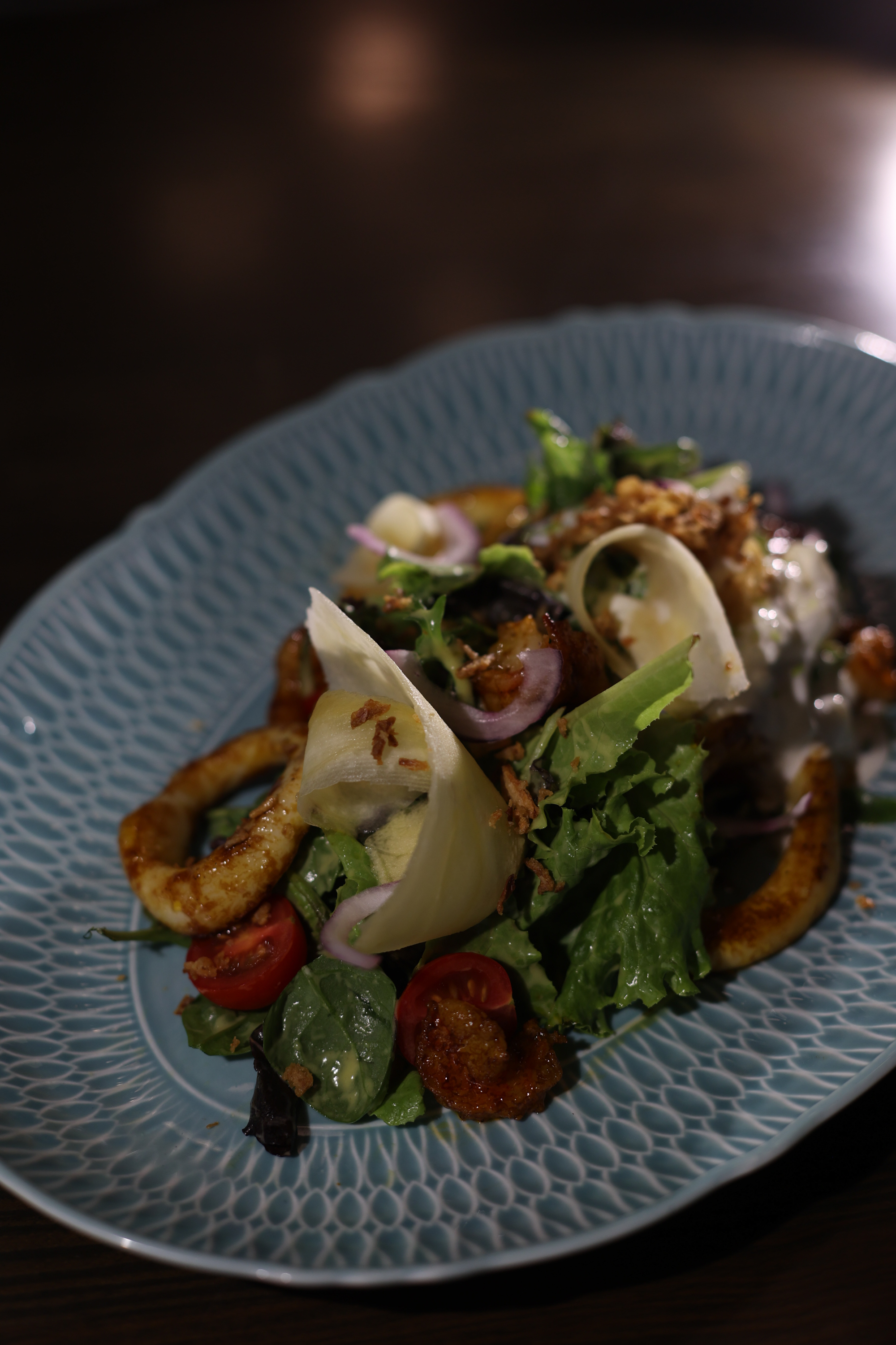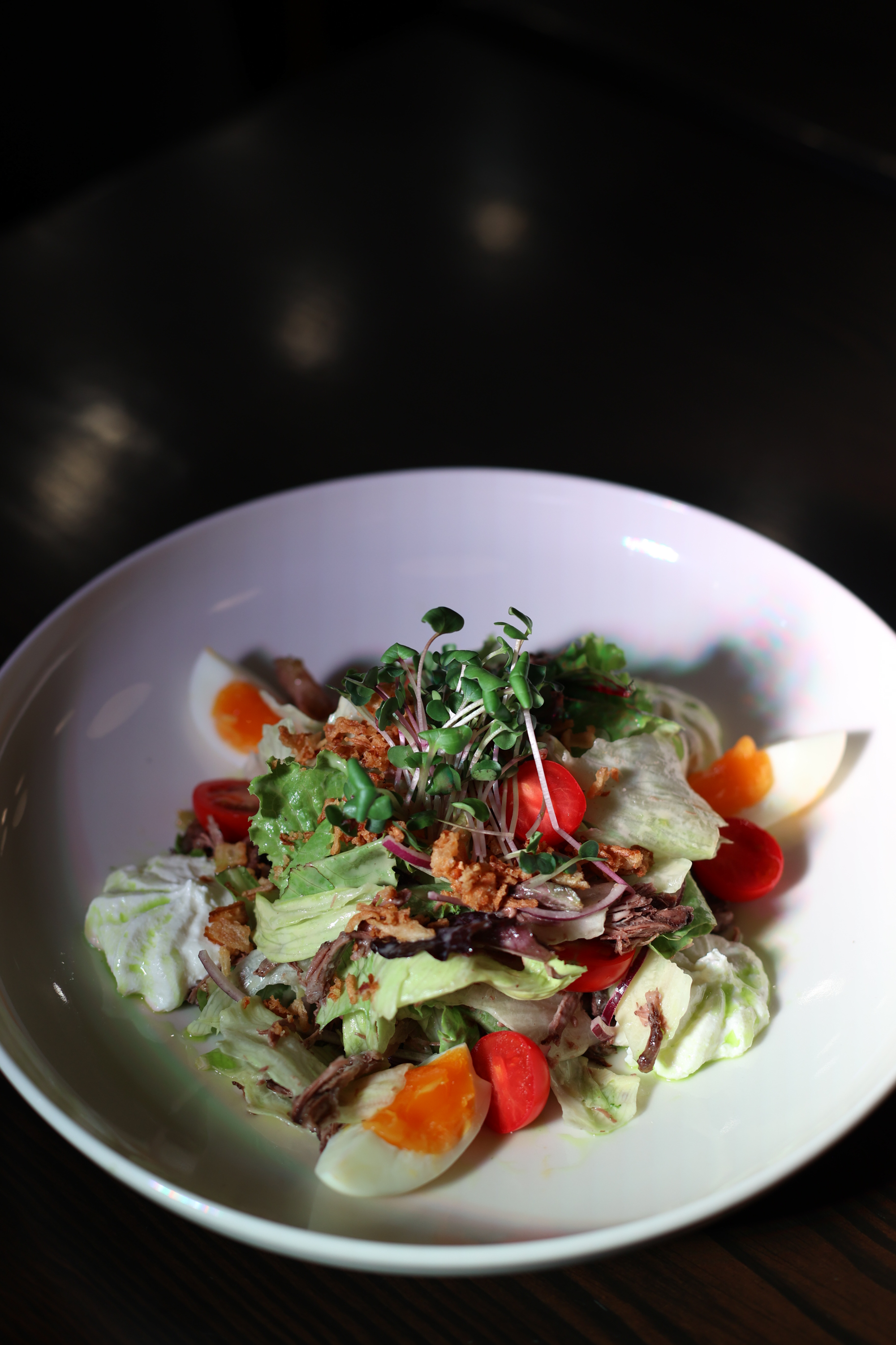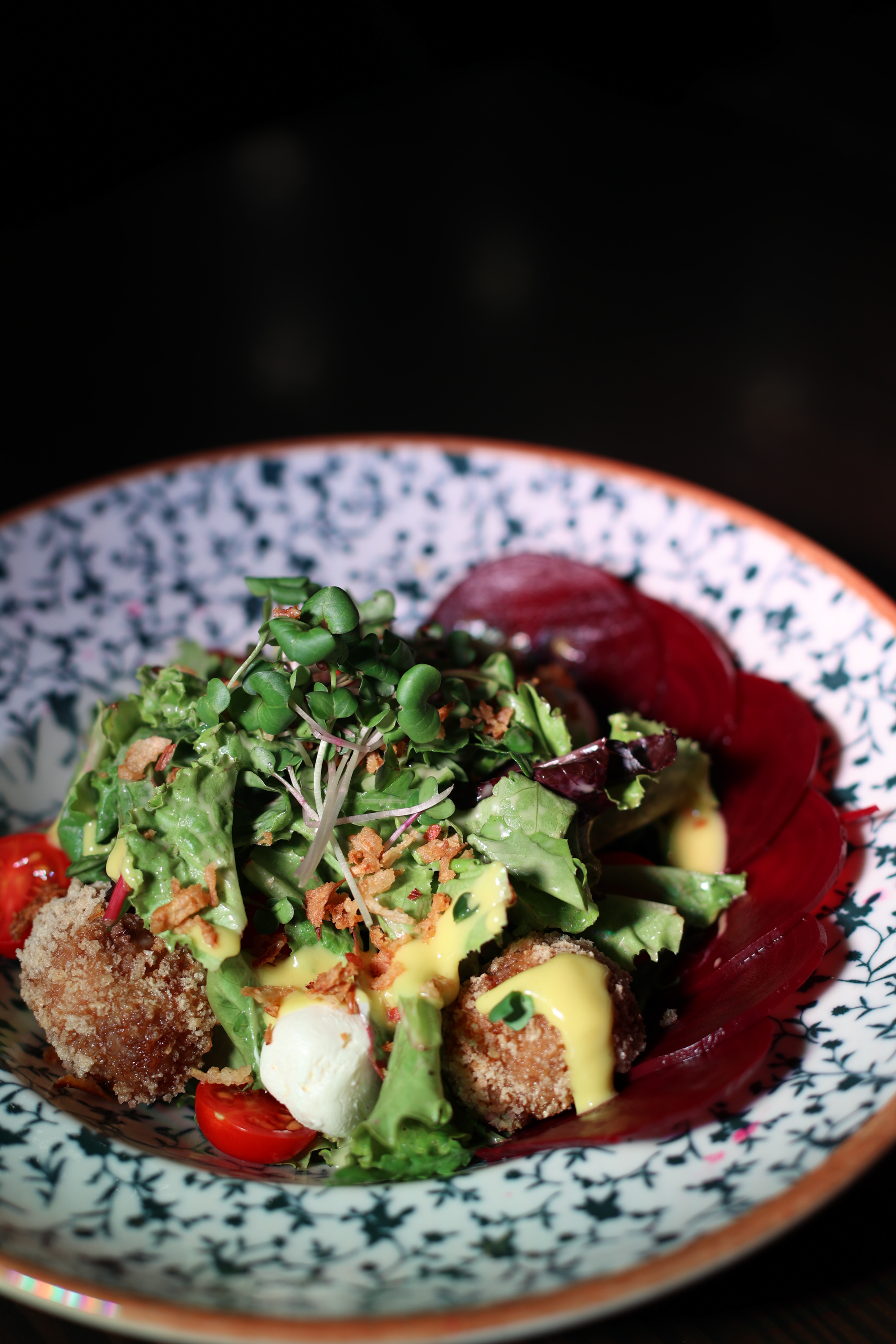 Салат з качиними болами та горгонзолою, з буряком та крем-сиром у медово-гірчичному соусі