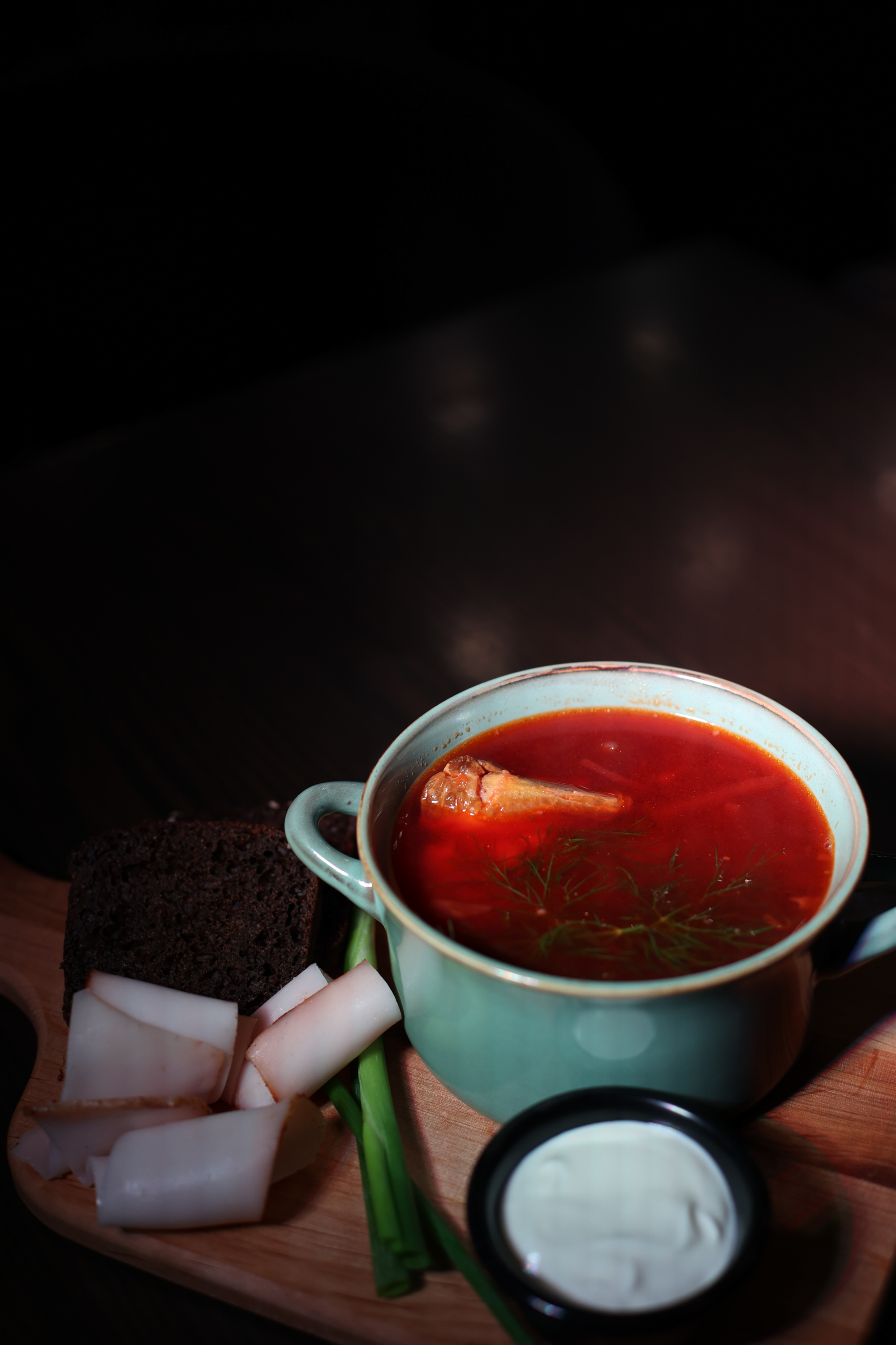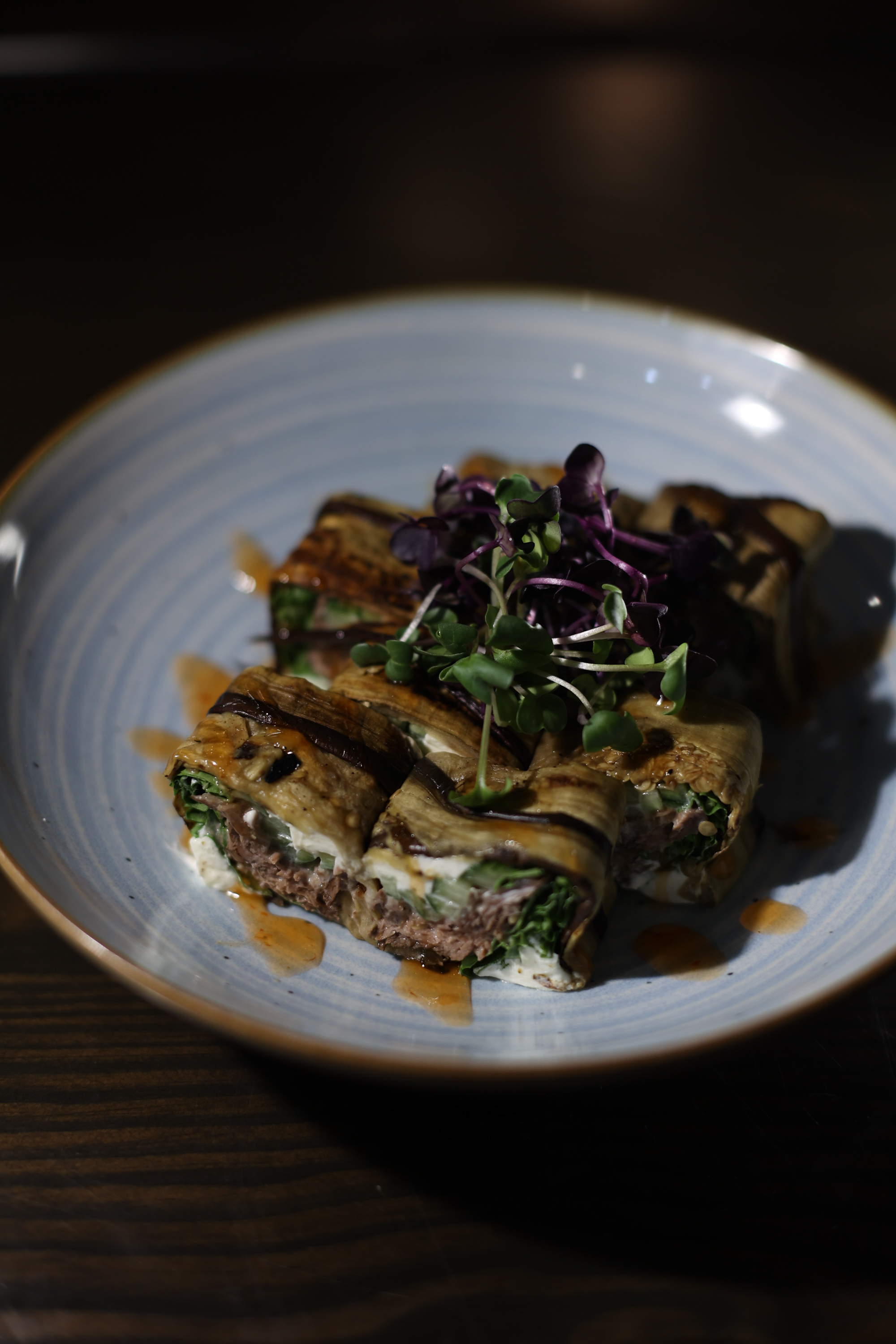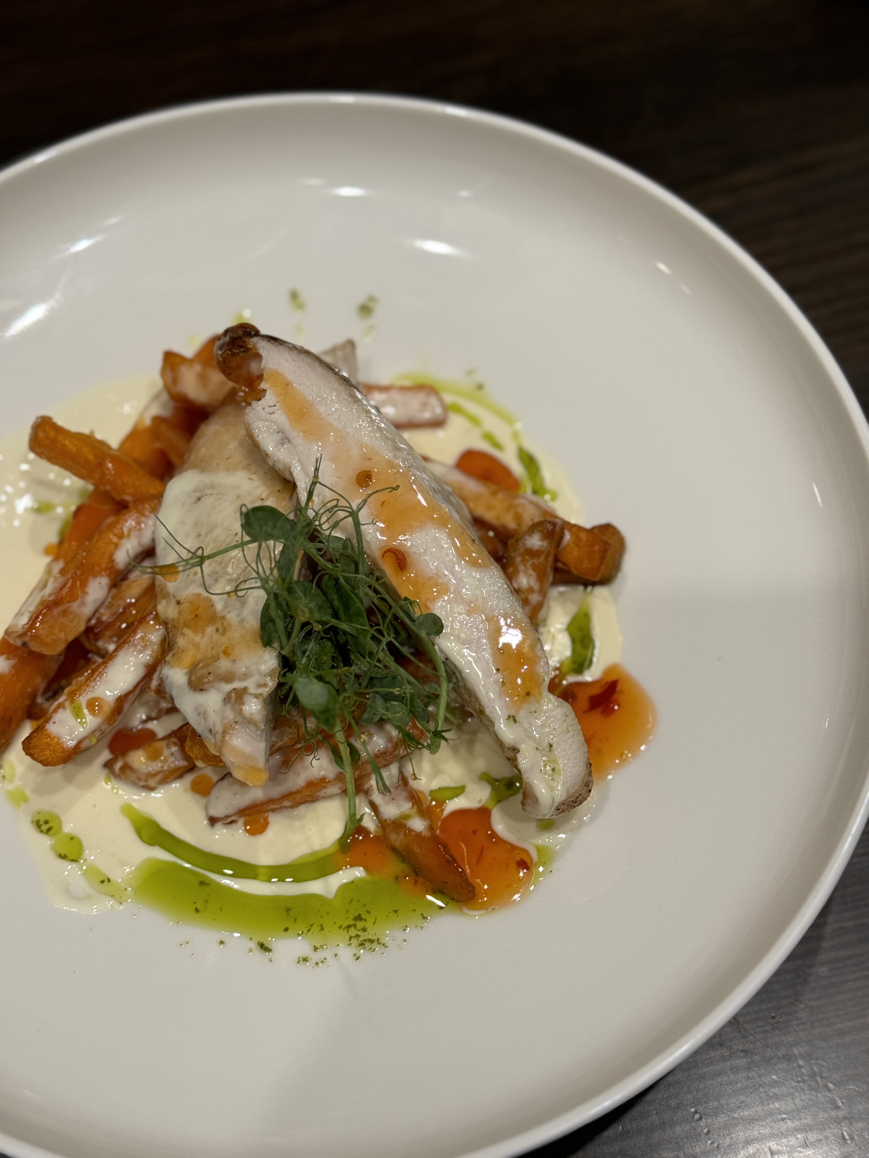 Салат з качиними болами та горгонзолою, з буряком та крем-сиром у медово-гірчичному соусі