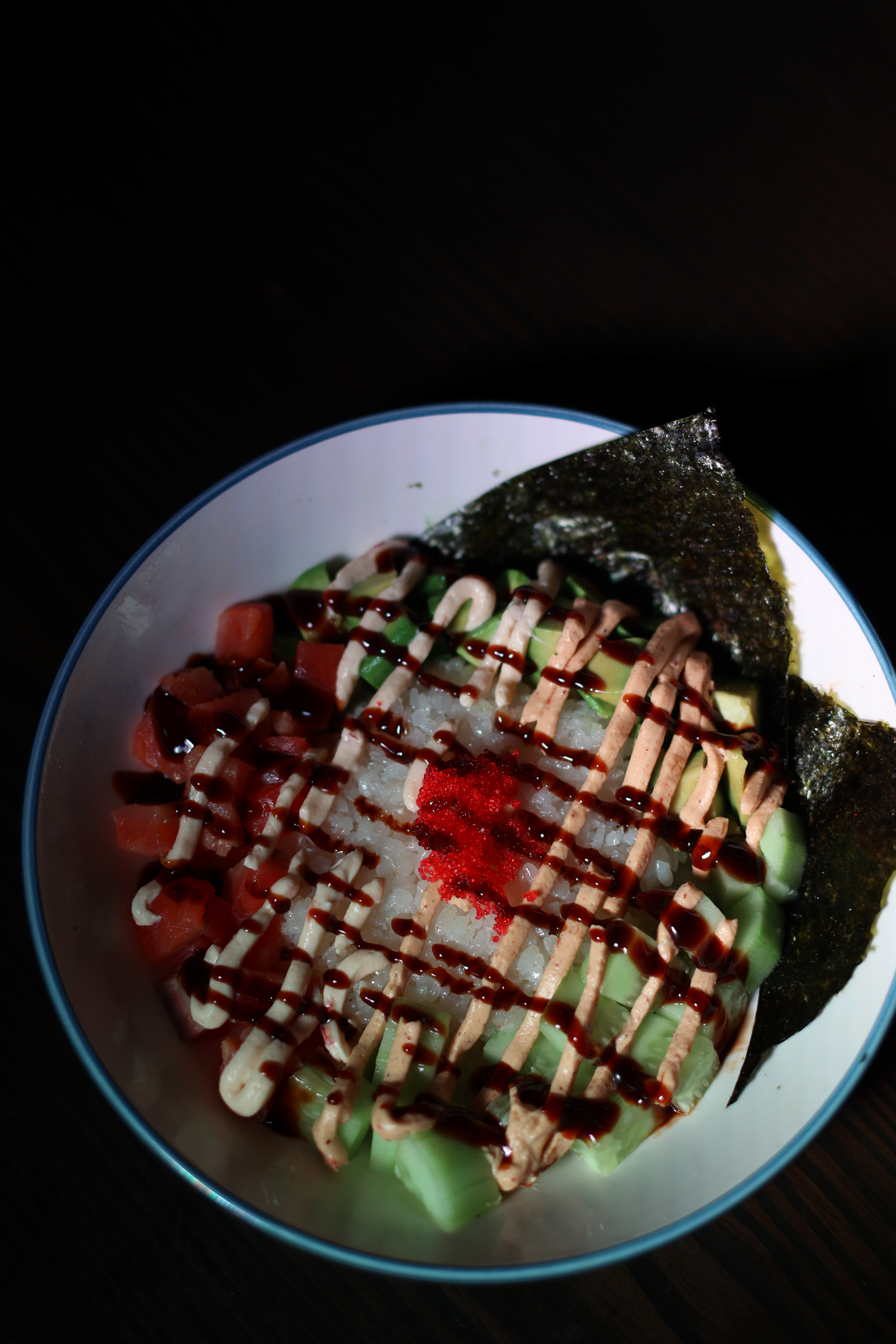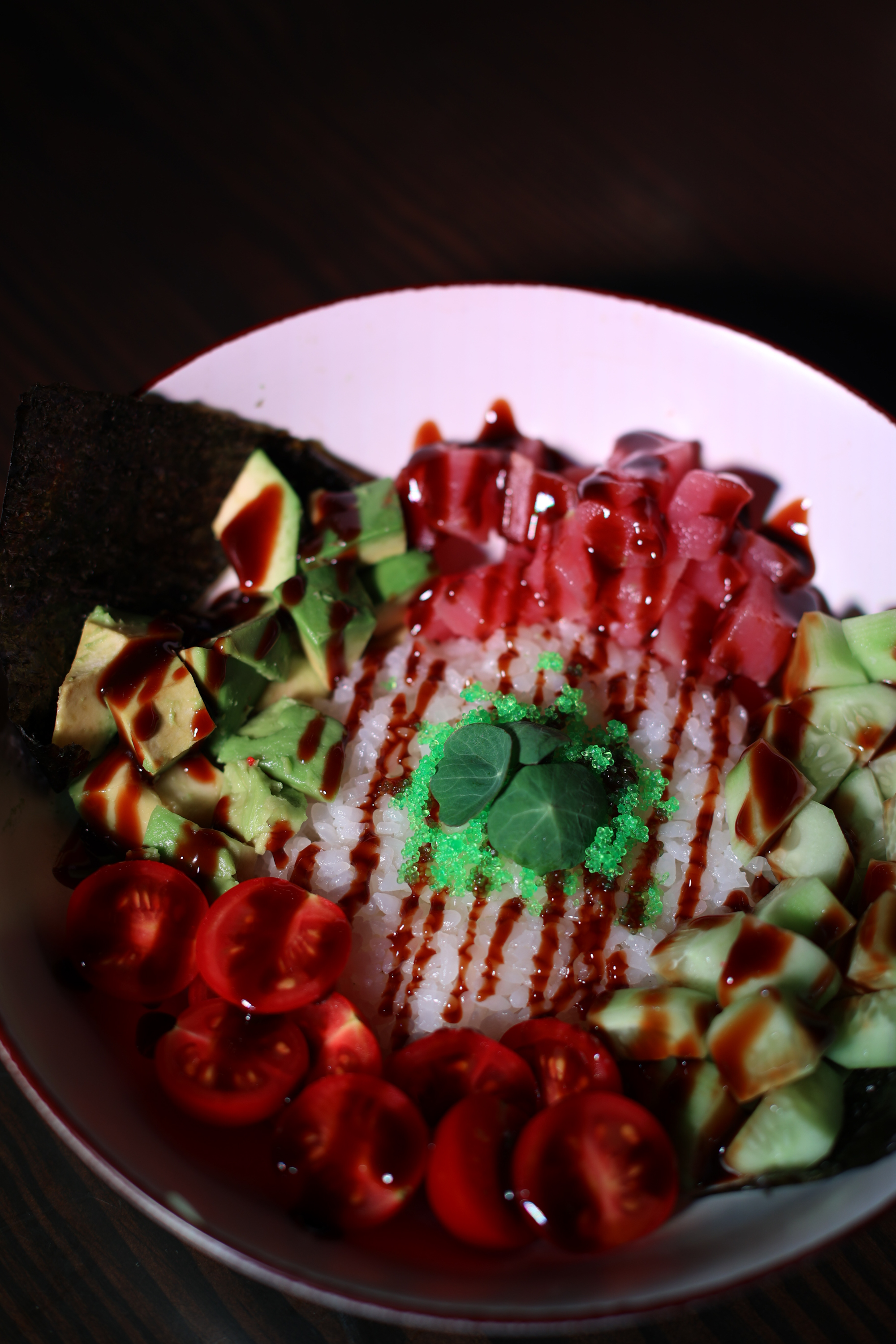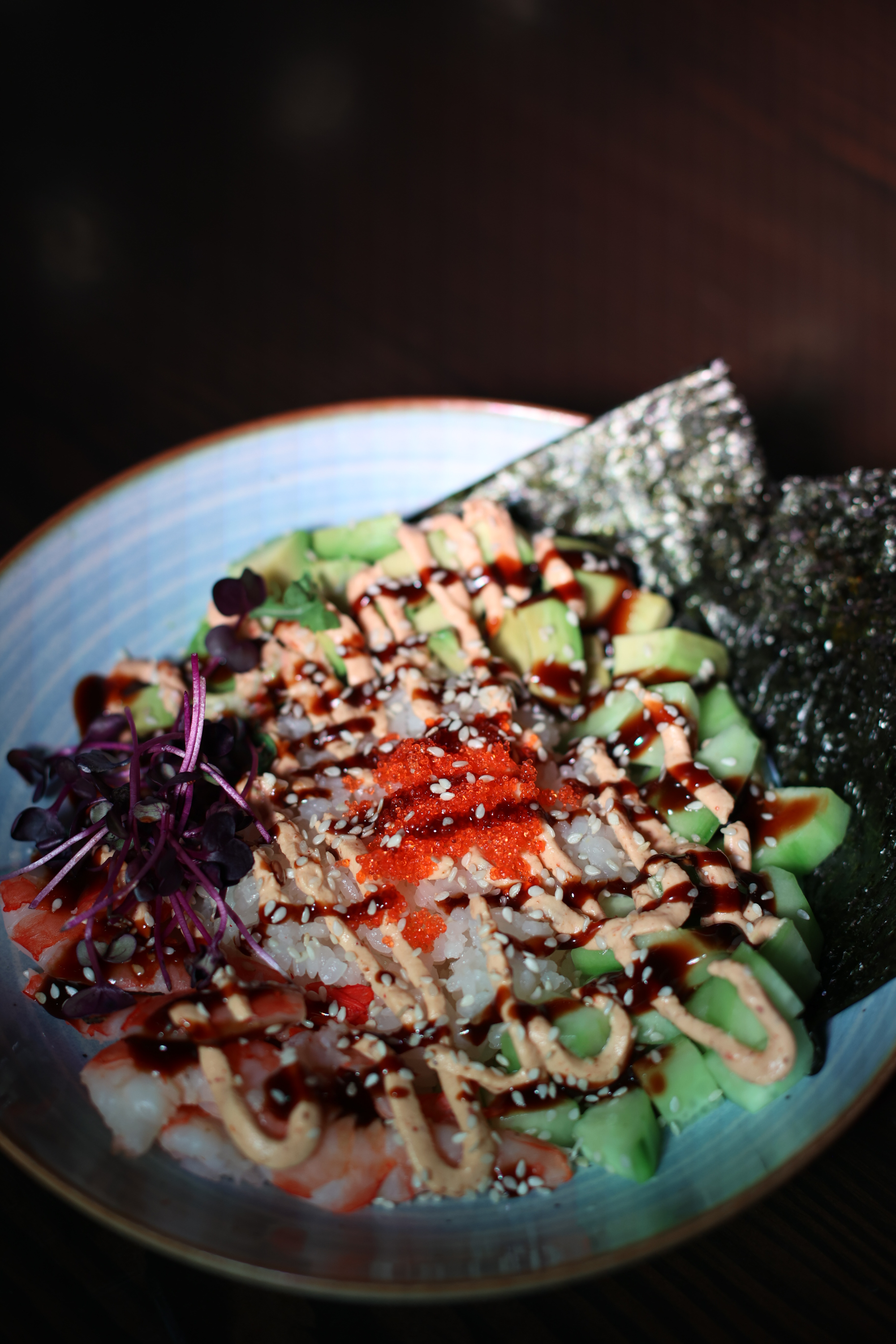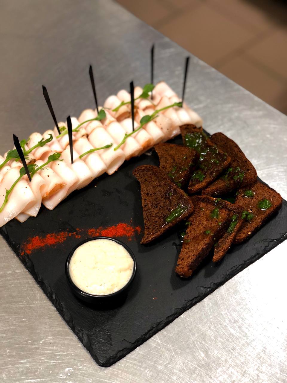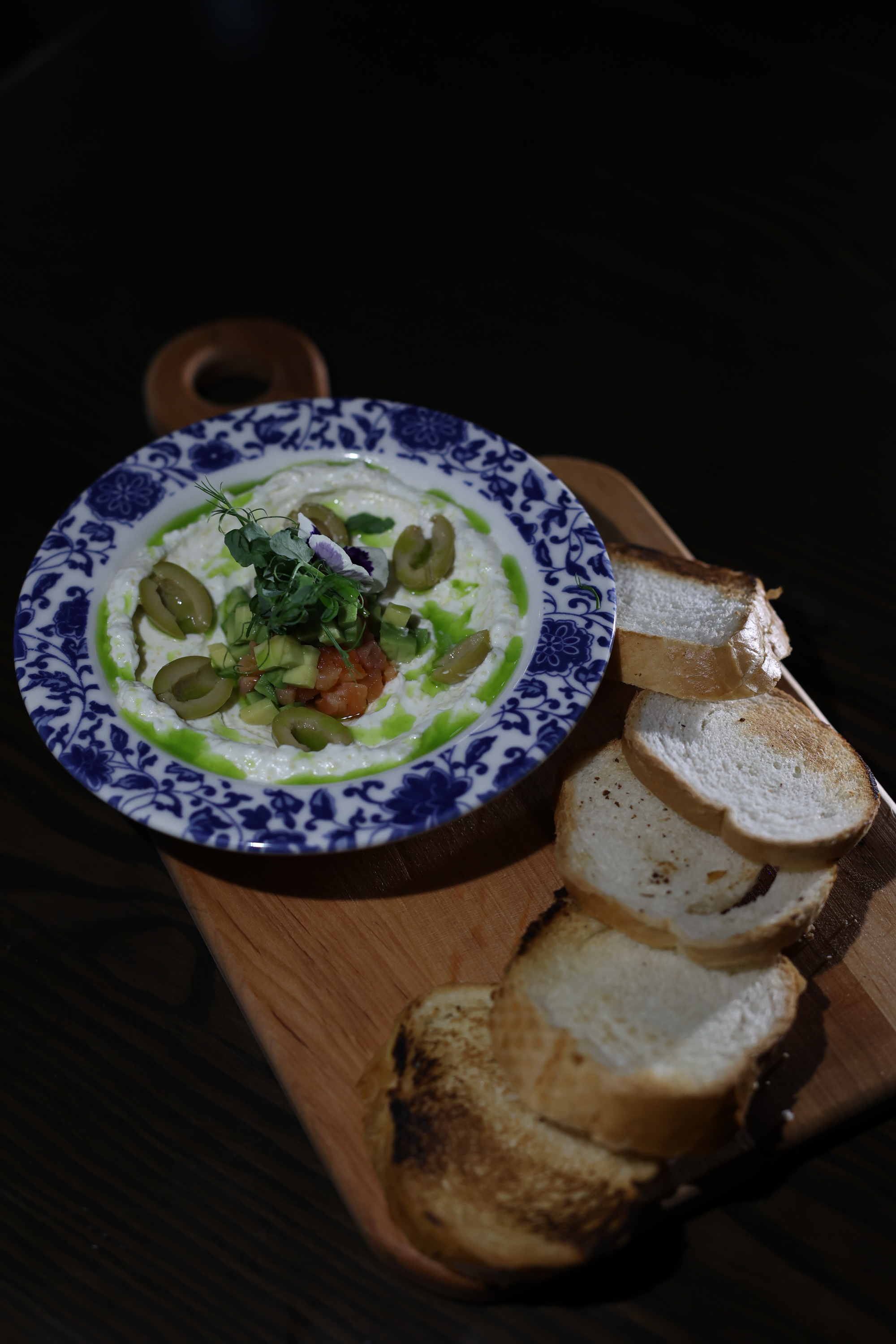 Мус з ікри мойви з авокадо, оливками та лососем з хрумким багетом