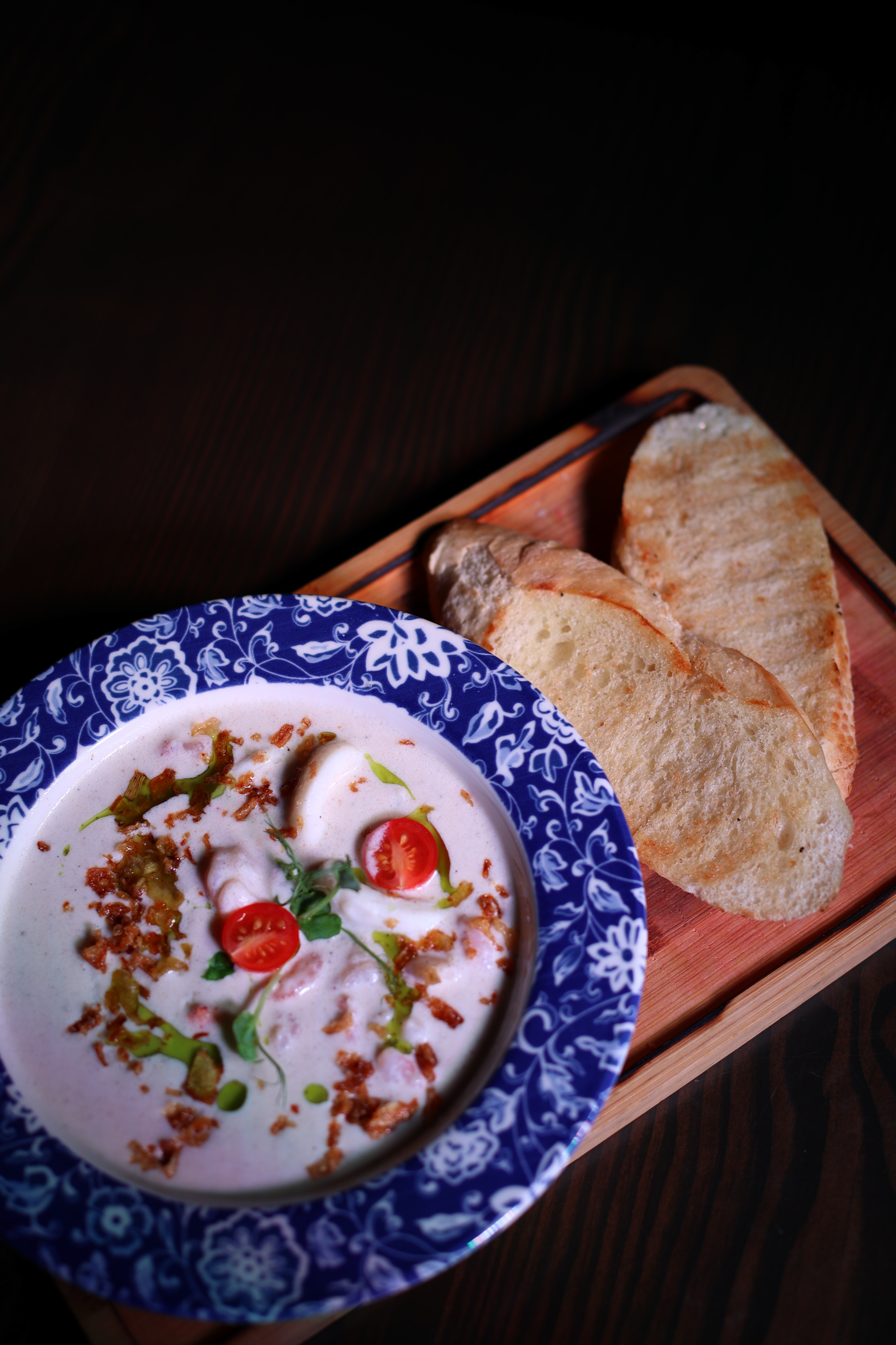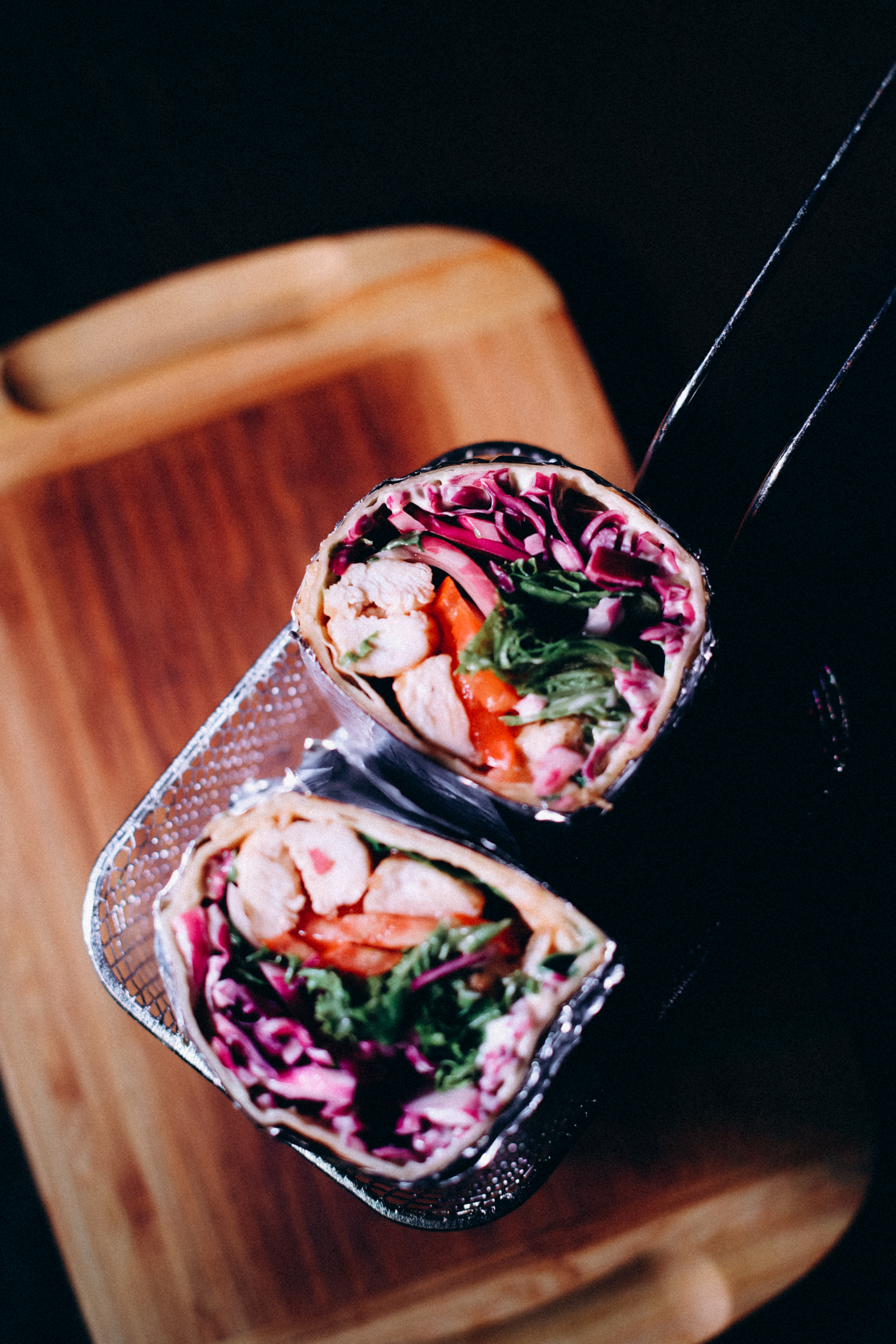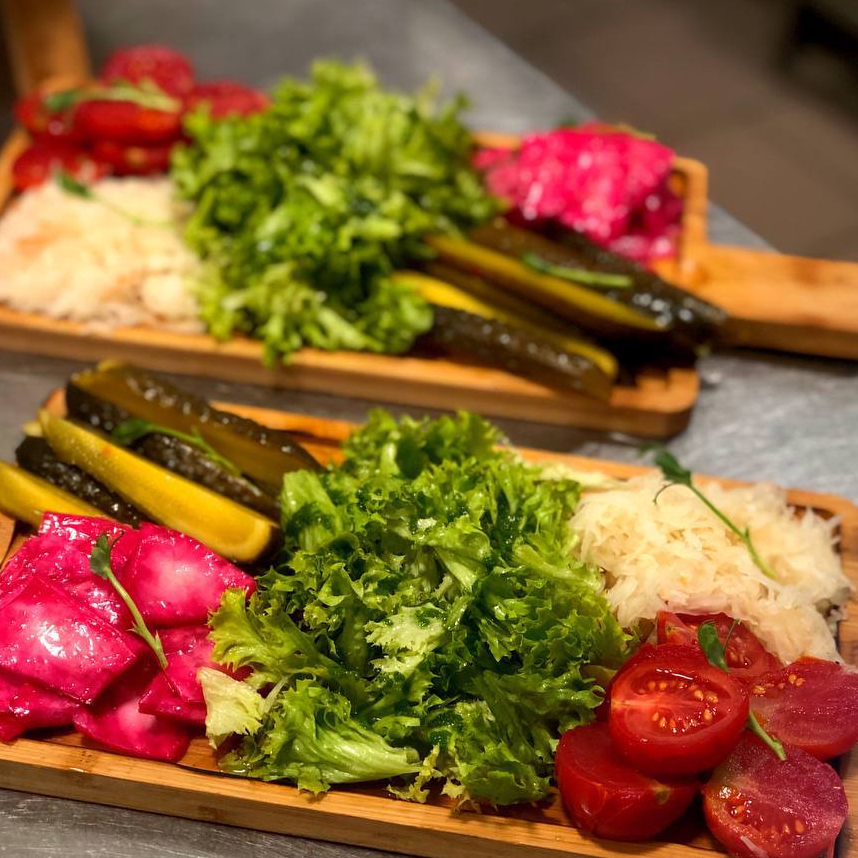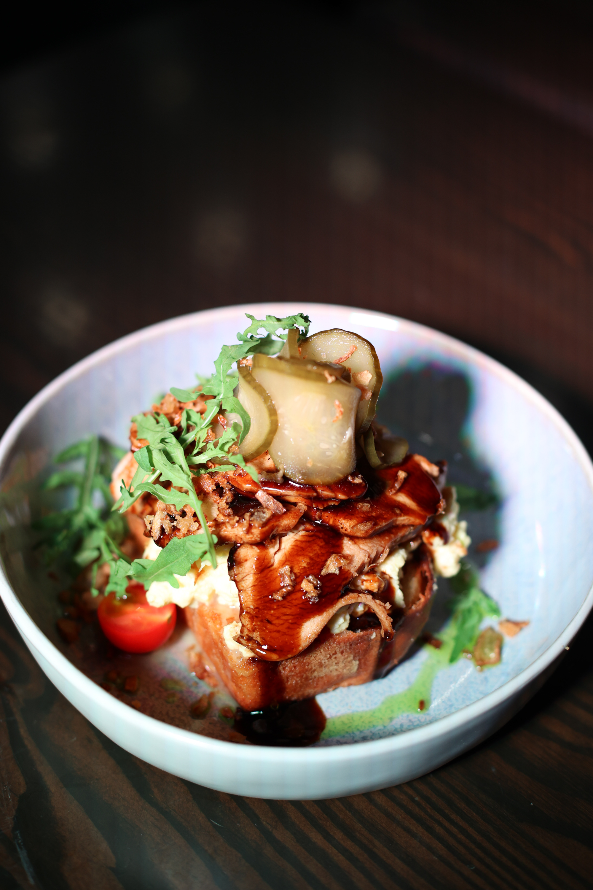 Данський бріош з куркою у кисло-солодкому соусі, руколою та огірками пікулі