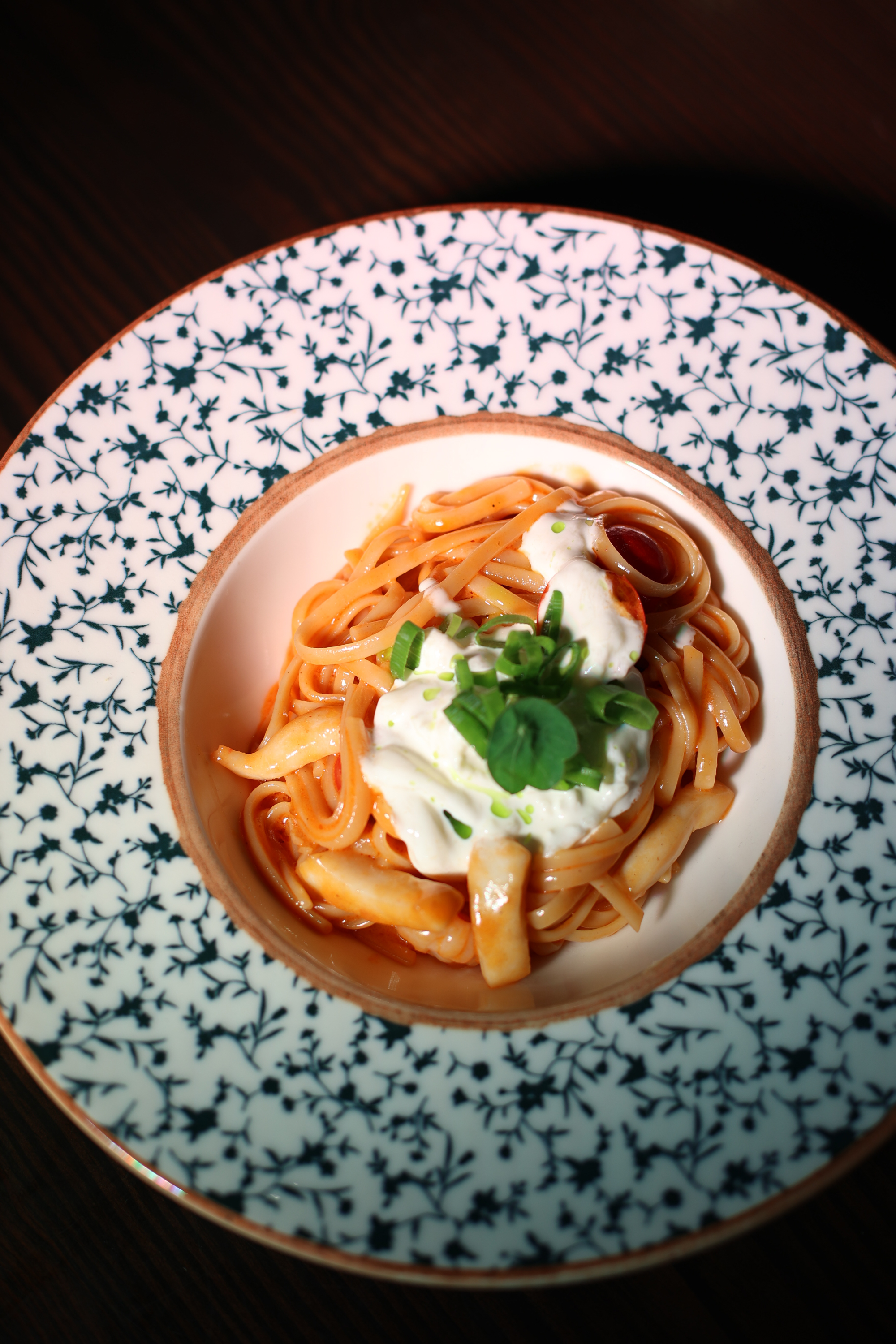 Паста лінгвіні з морепродуктами та стратчателлою в креветковому соусі біск
