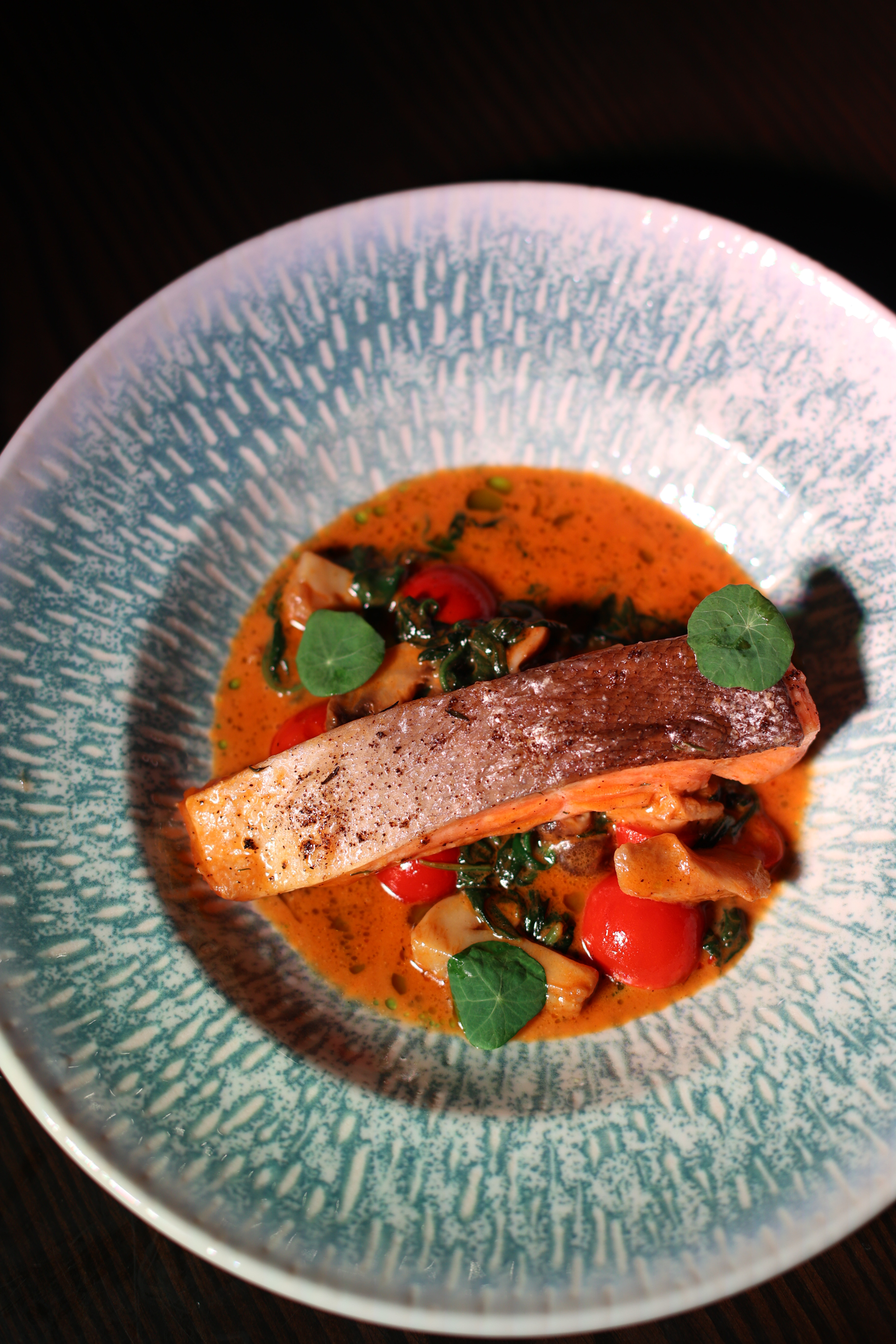 Стейк з лосося з лісовими грибами з томатами чері у креветковому соусі