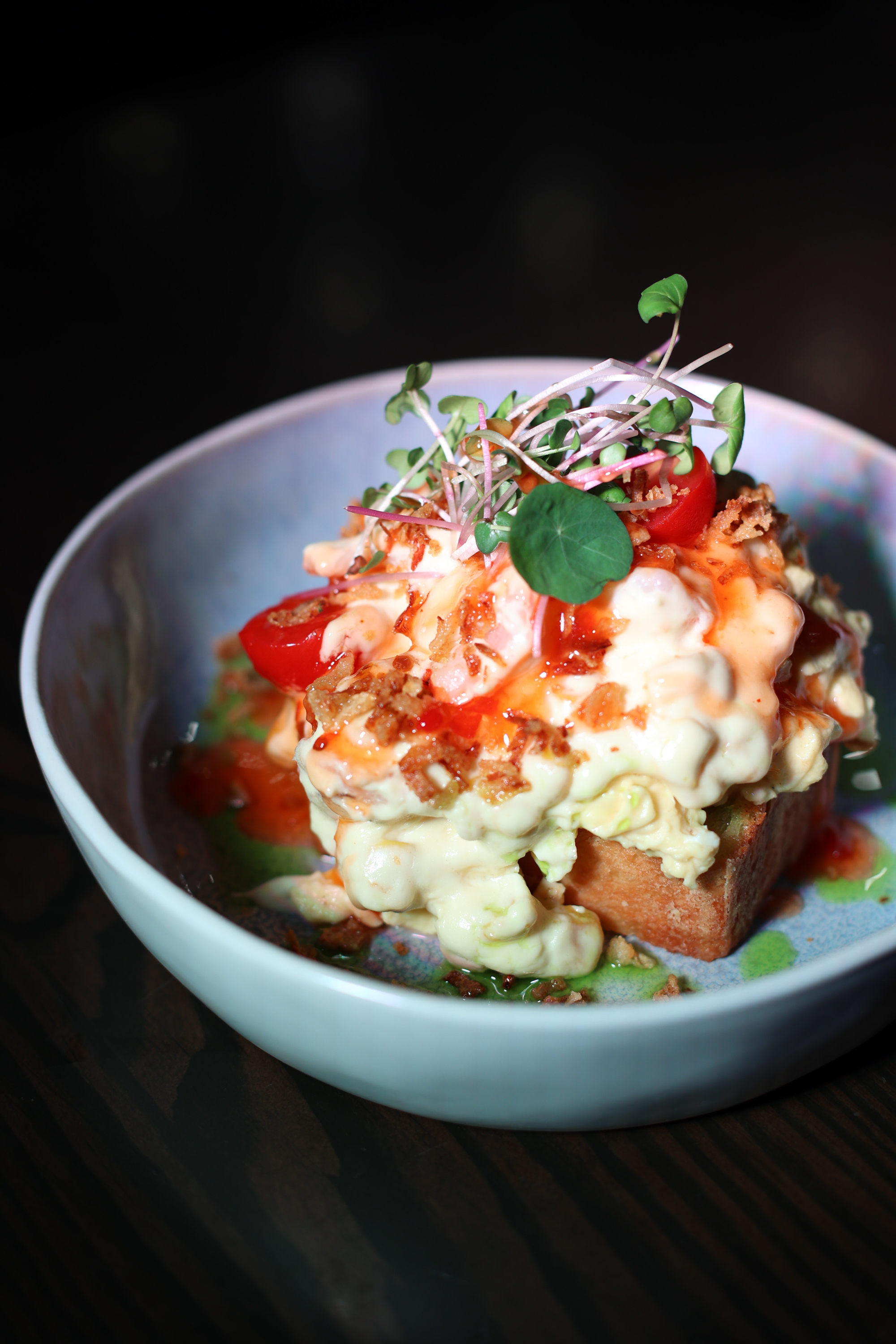 Італійський бріош з креветками та скремблом під сирним соусом чеддер