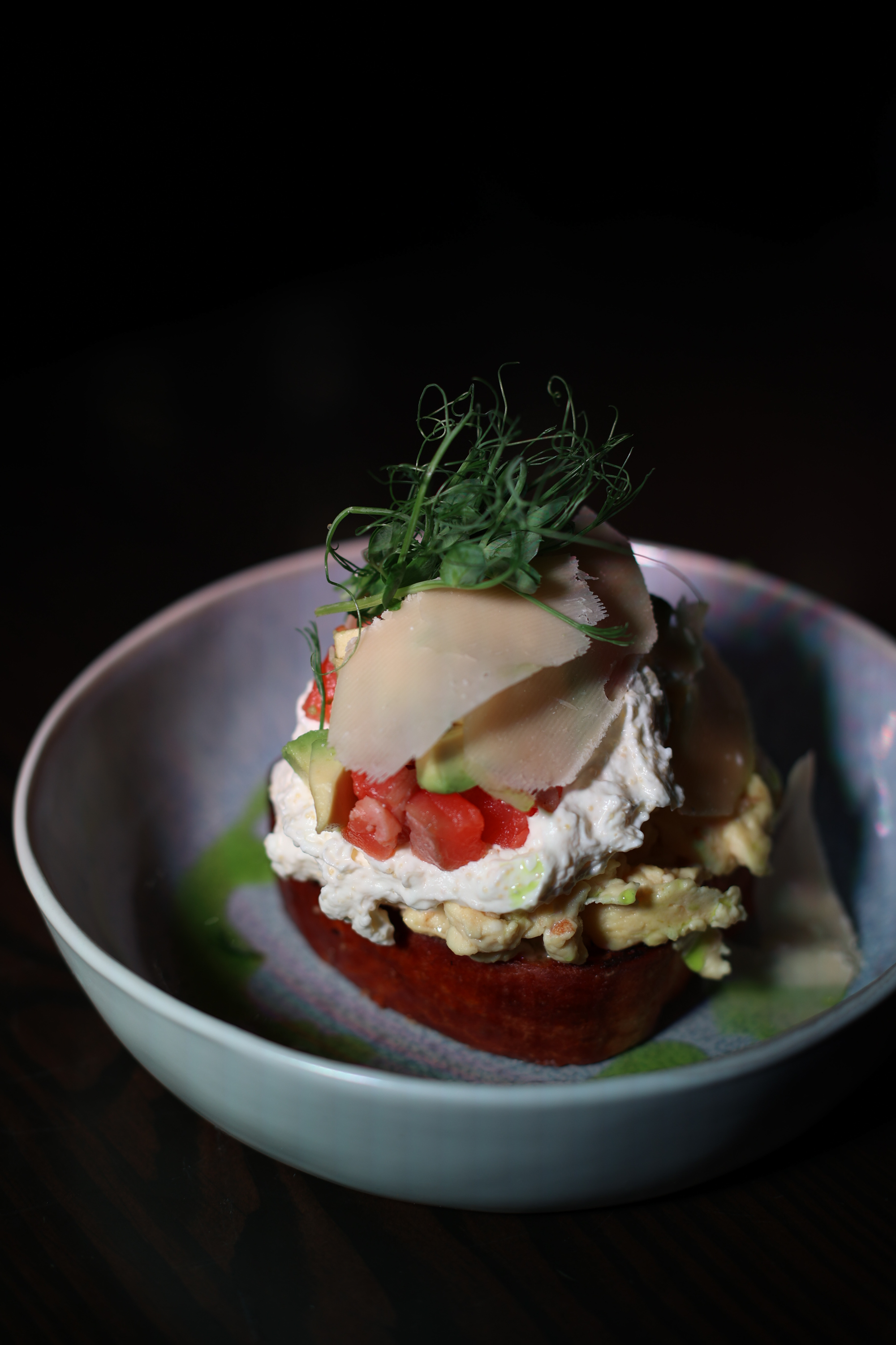 Паризький бріош з лососем та скремблом під соусом з ікрою