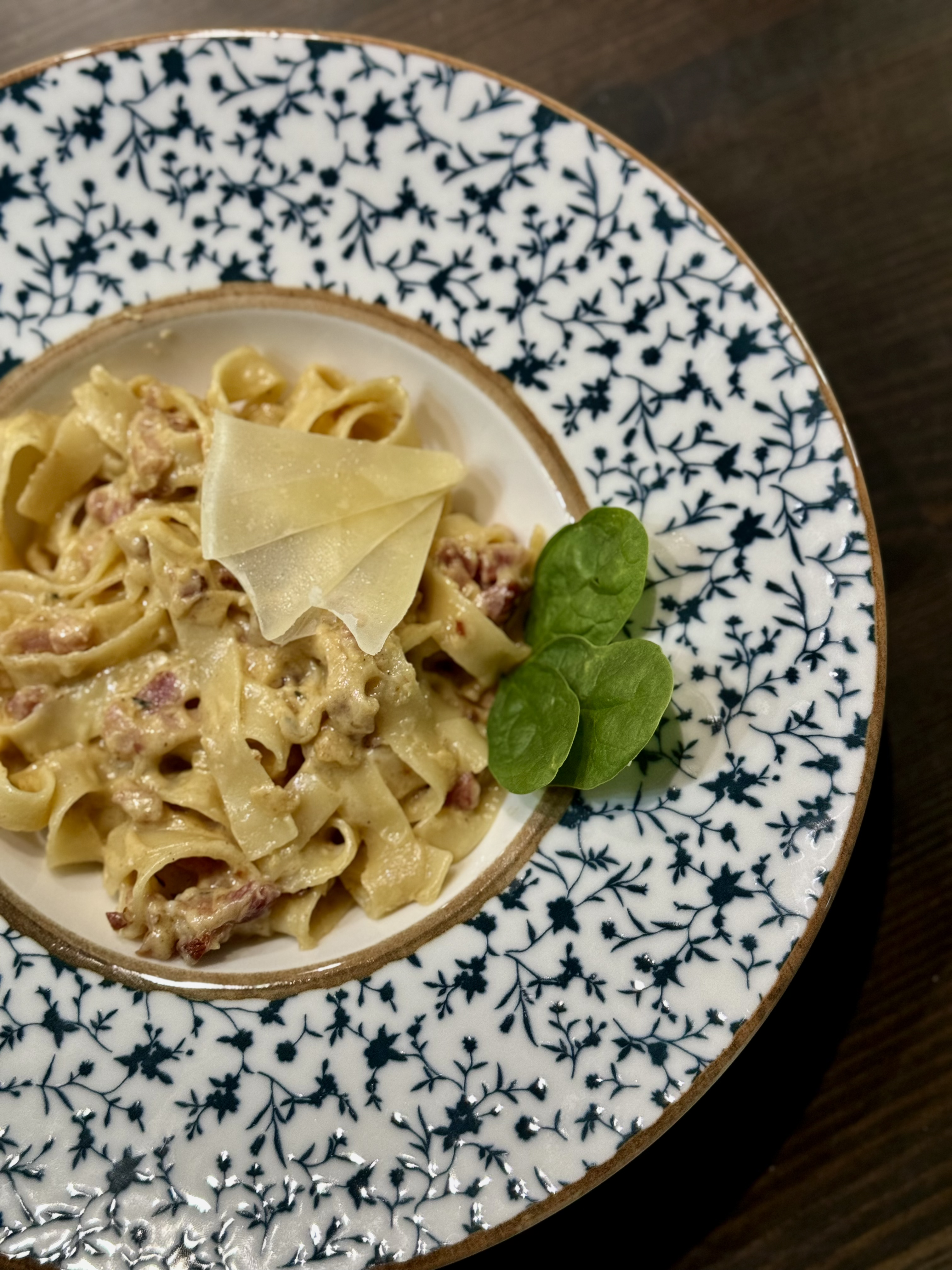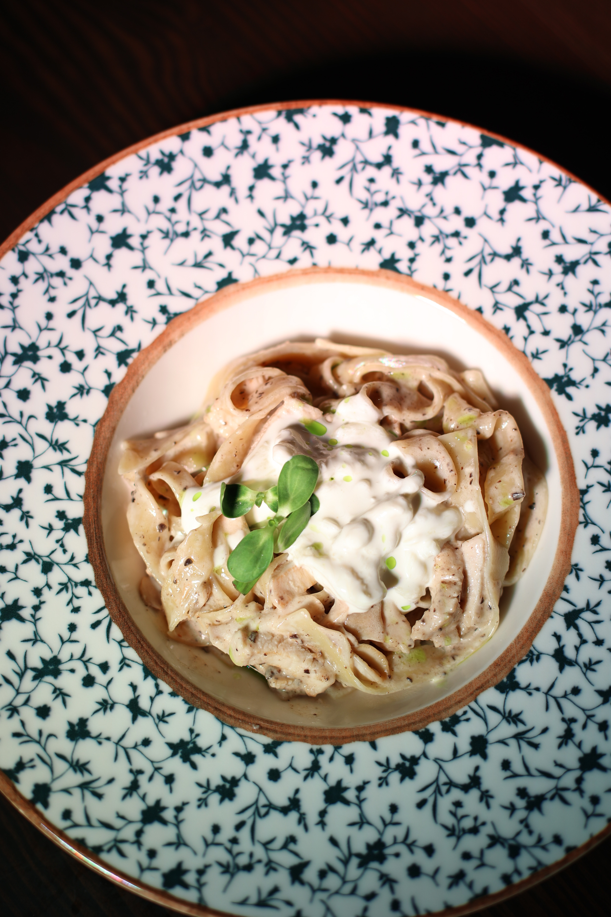Фетучіні з фермерським курчам, грибами та чері у трюфельному соусі зі стратчателлою