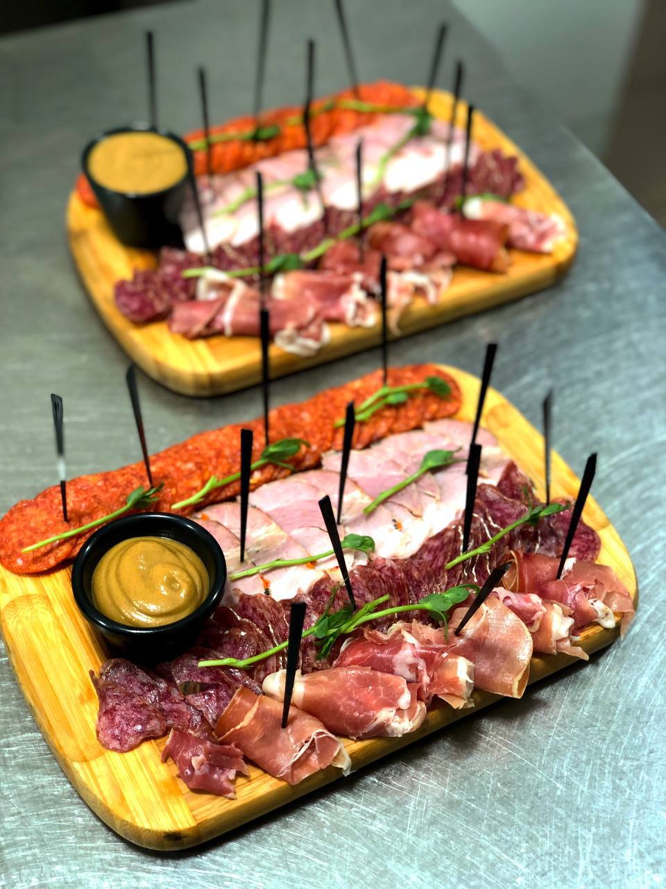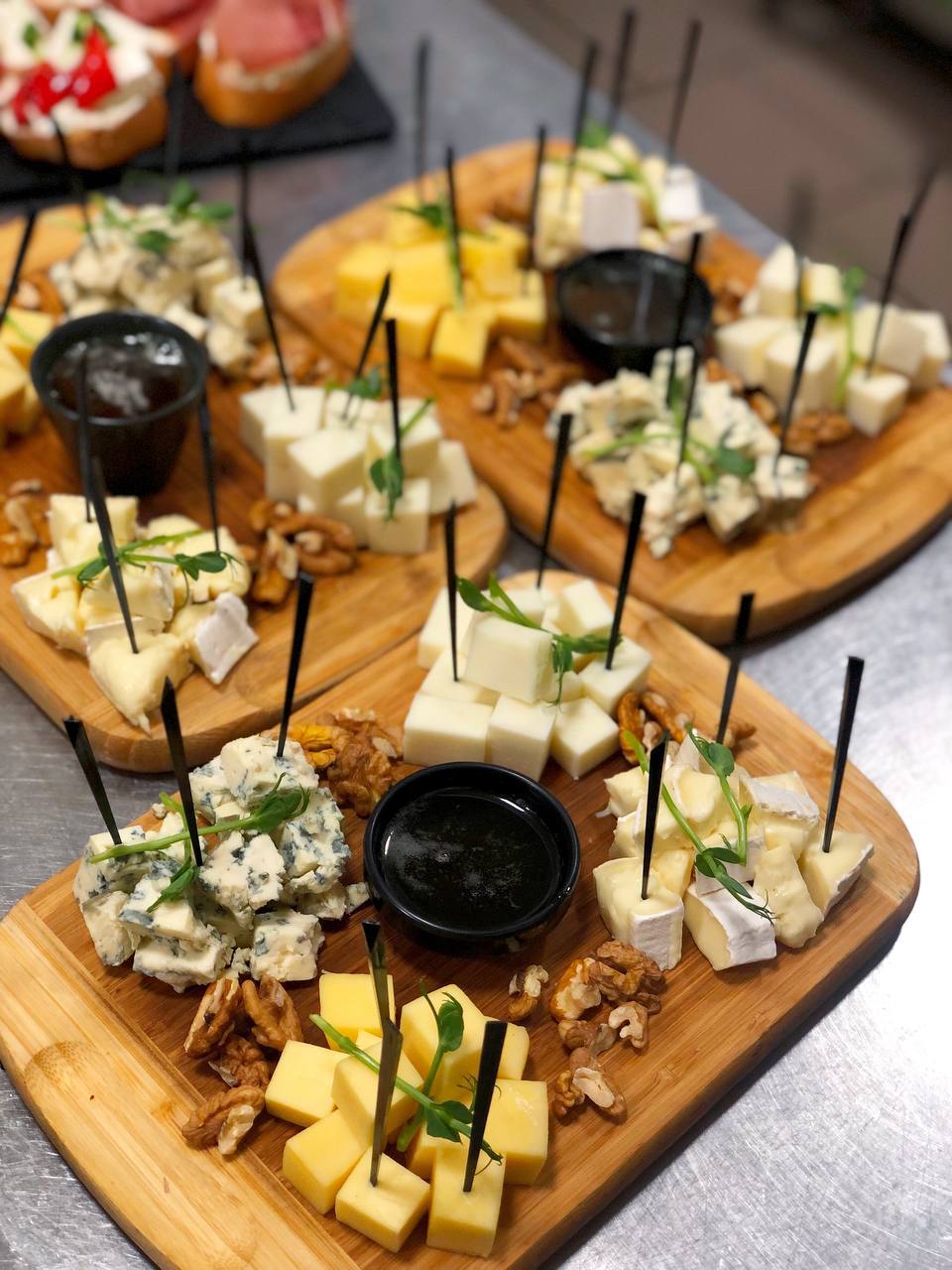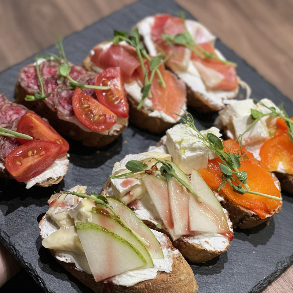 брускети з прошуто, салямі і чері, болгарським перцем та фетою, сиром брі та грушею