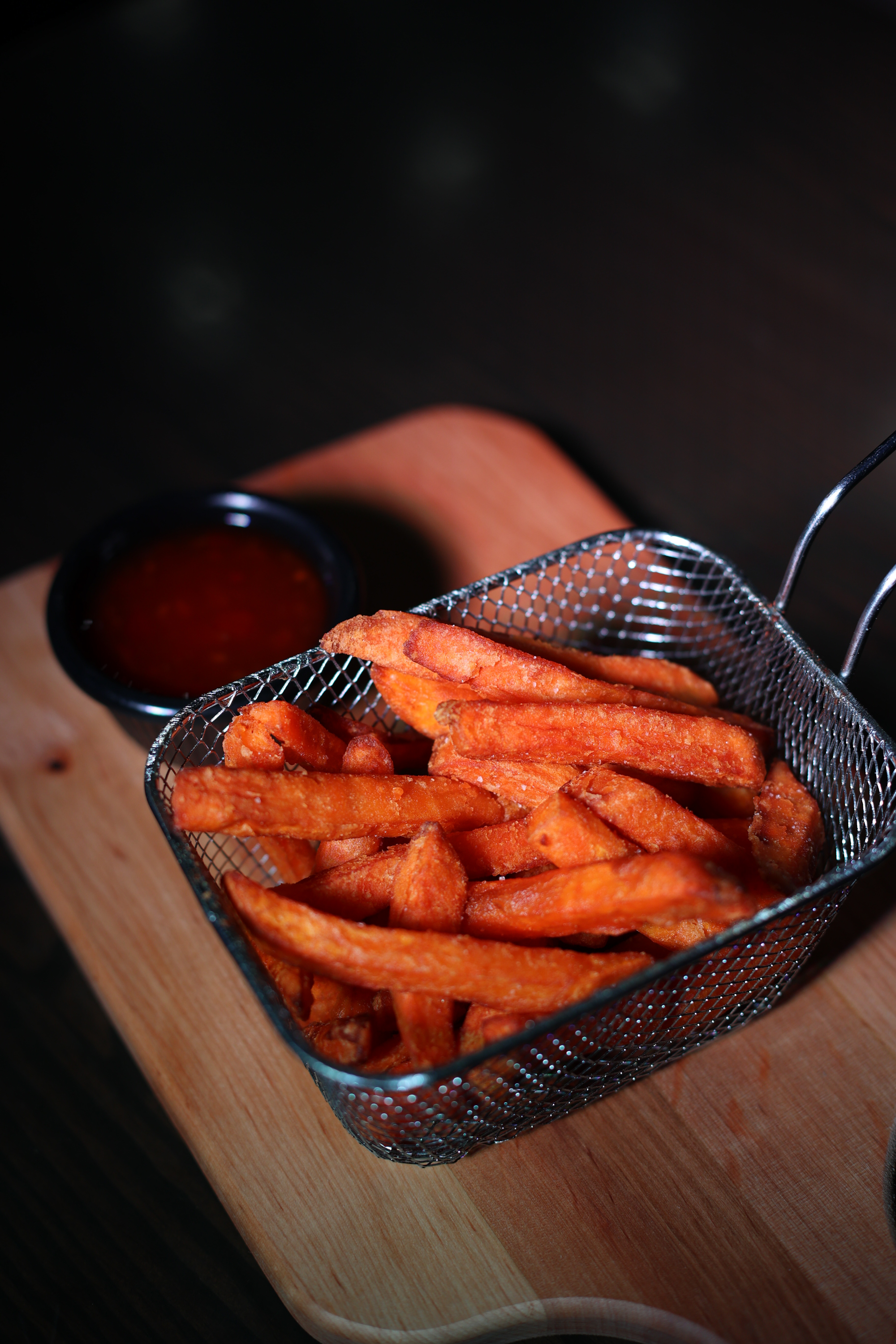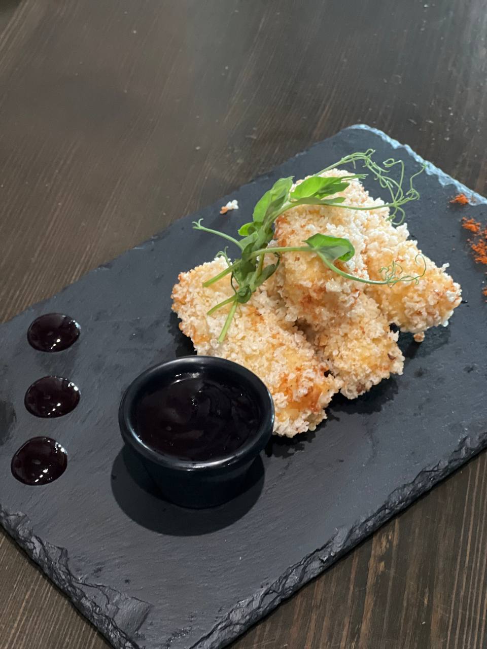 цибулеві кільця, кільця кальмарів, курячі нагетси, курячі крильця, картопля по-селянськи, ковбаски, соус