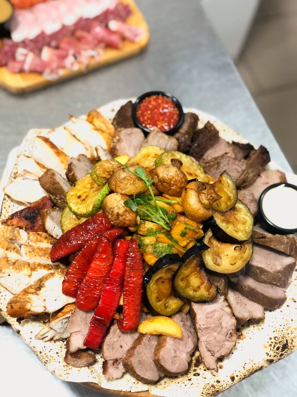свинина, куряче філе, яловичина, овочі гриль,картопля по-селянськи, соус